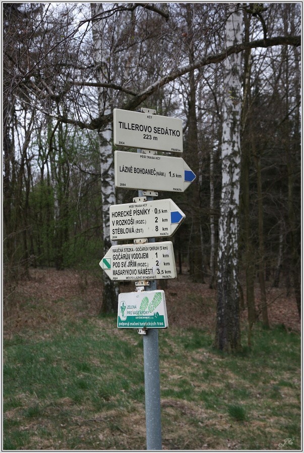 Turistické rozcestí na okraji lesa nedaleko Lázní Bohdaneč u tzv. Tillerova sedátka. Prochází tudy modrá značka z Lázní Bohdaneč do Stéblové (viz https://www.turistika.cz/trasy/k-ruchadlu-bratrancu-veverkovych a