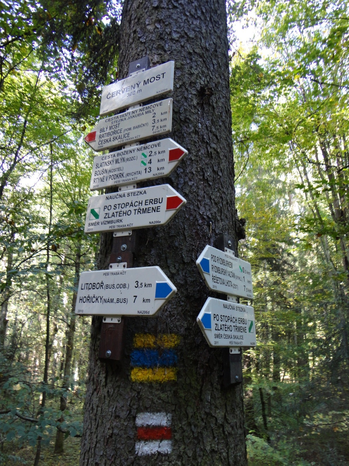 Turistický rozcestník, který se nachází nedaleko tzv. Červeného mostu přes řeku Úpu, ukazuje turistům cestu do dvou směrů. Po červené značce ve směru Chvalkovice, Větrník, Malá a Česká Skalice, Ratibořice, Bílý most, Pohodlí - Slatinský mlýn, Boušín, Havlovice, Podhradí, Rtyně v Podkrkonoší a po značce modré ve směru Chvalkovice, Hořičky, Litoboř - rozcestí pod Rýzmburkem, Rýzmburský altán, Žernov, Studnice, Řešetova Lhota, rybník Špinka, Olešnice. Samostatné směrníky ukazují značení naučné stezky Po stopách erbu zlatého třmene.