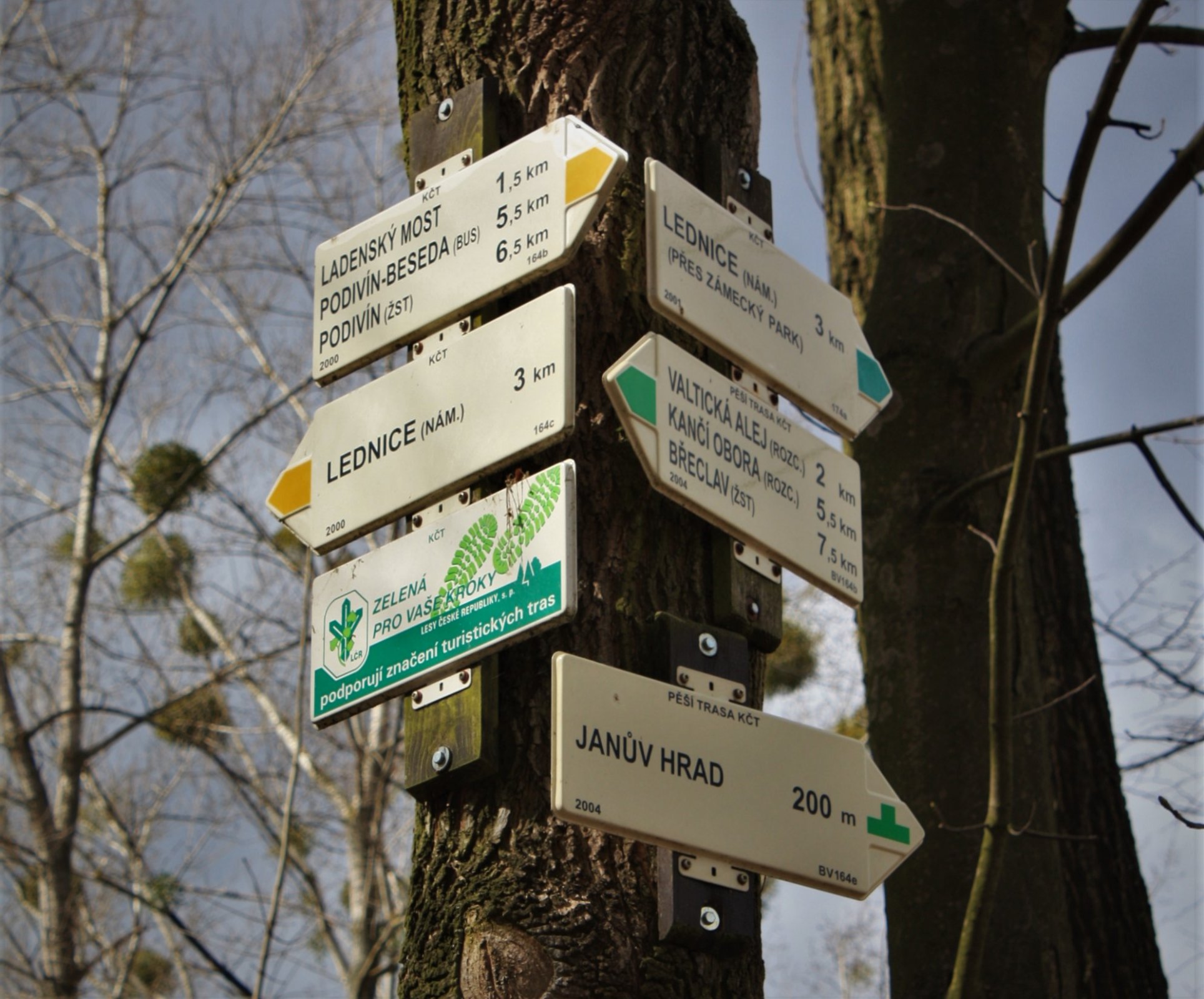 Toto významné turistické rozcestí se nachází uprostřed lužního lesa v přírodním parku Niva Dyje, který je součástí Lednicko-valtického areálu. Prochází tudy zeleně a žlutě značená turistická cesta a dále pak krátká zelená odbočka k Janovu hradu. Zelená vede jedním směrem jedinečným luhem tzv. Anglickou cestou přes rozcestí Valtická alej a Kančí obora do Břeclavi. Opačným směrem pak dojde do Lednického parku a končí v Lednici na náměstí. Žlutá značka odtud vede na rozcestí Ladenský most a končí v Podivíně na nádraží. Na druhou stranu pak kolem Loveckého zámečku Mlýnskou cestou na kraj Lednice a dále Slováckou cestou až na lednické náměstí. Krátká zelená odbočka nás přivede ke Staré Dyji, přejde lávku a končí u zříceniny Janova hradu.