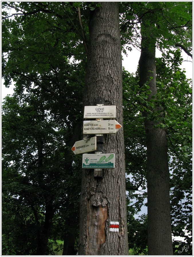 Směrníky na stromě ukazují směr červeně značené trasy z Pardubic (od zámku) na Počaply, Kunětice a Kunětickou horu. Zajímavostí tohoto místa je, že Labe a umělý kanál Halda, o němž je na tabuli nad směrníky zmínka, dělí jen několik metrů "suché" země. Hladina Haldy je navíc o pár metrů výše než hladina Labe.