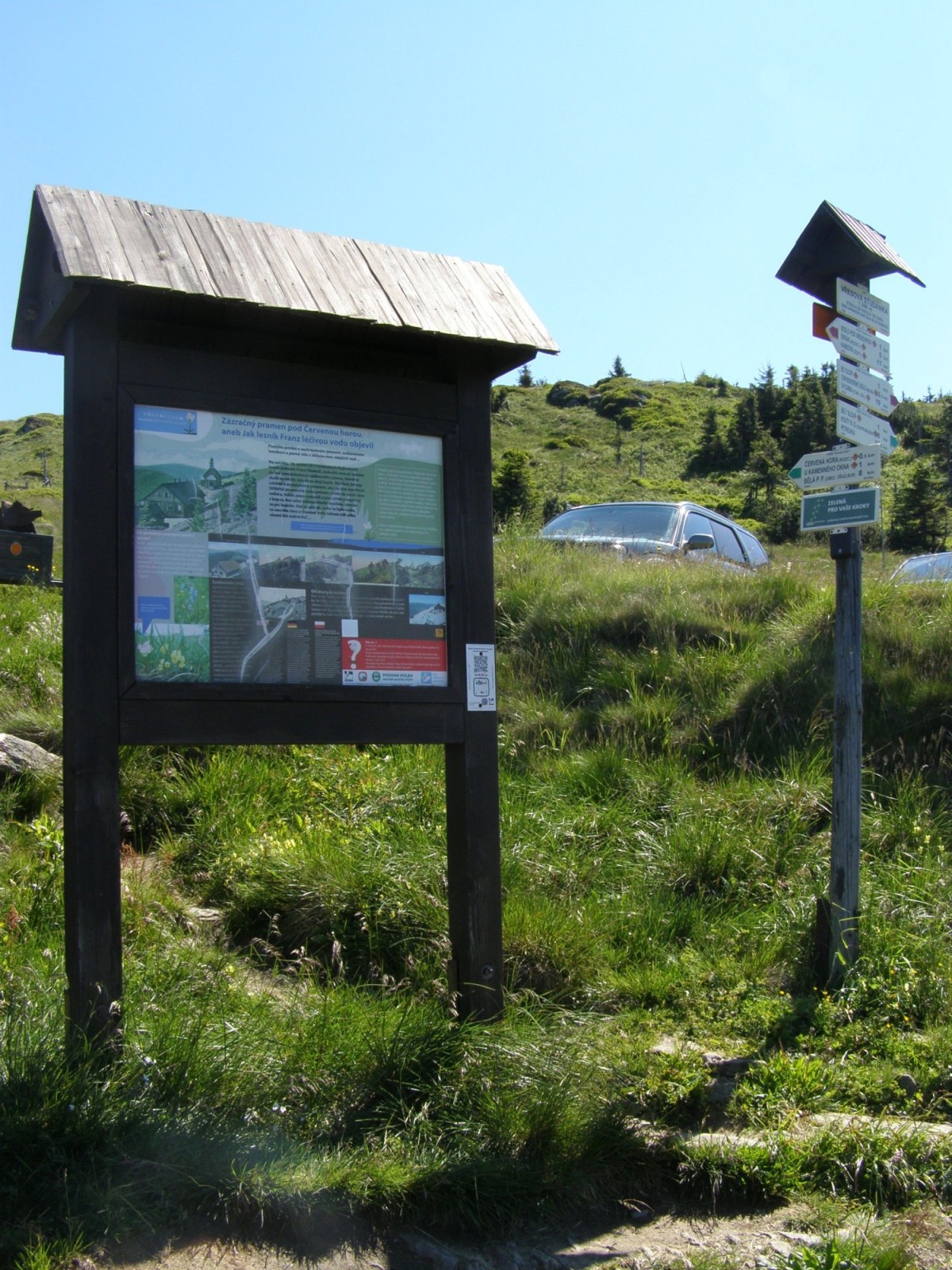 Turistický rozcestník, který se nachází v sedle pod Vřesovou studánkou ukazuje turistům cestu do tří směrů. Po značce červené ve směru Červenohorské sedlo, Bílý sloup, Vřesová studánka - Trojmezí, Keprník, Šerák, Ramzová, po značce žluté ve směru Kouty nad Desnou, Poniklý potok - U kamenného okna, Červená hora, Bílý sloup a po značce zelené ve směru Vřesová studánka - Vozka,…