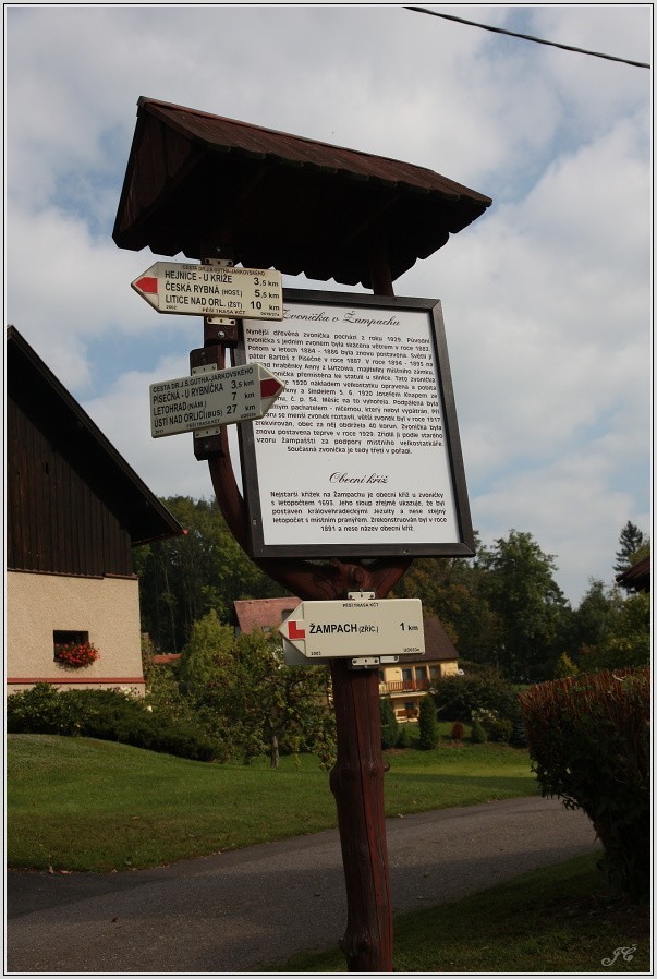 Turistické rozcestí se nově nachází u mostku přes rokli na okraji zámeckého parku. Původní na návsi u zvoničky bylo zrušeno. Křižují se zde červená a žlutá turistická cesta. Červená vede východním směrem na Písečnou (dolní konec), Letohrad, Dolní Dobrouč, k Horákově kapli a končí v Ústí nad Orlicí. Severozápadním směrem vede pak na Hejnici, Českou Rybnou, Litice nad Orlicí a do Potštejna. Žlutá značka vede do Písečné na horní konec, dále na Kozinec, Dlouhoňovice a do Žamberka. Opačným směrem pak směřuje na Hlavnou u Hnátnice, Oldřichovice, Ústí nad Orlicí, Kerhartice a Andrlův Chlum. Dále zde začíná červeně značená odbočka na zříceninu hradu Žampach, která vede část cesty po červené značce ve směru na Hejnice.