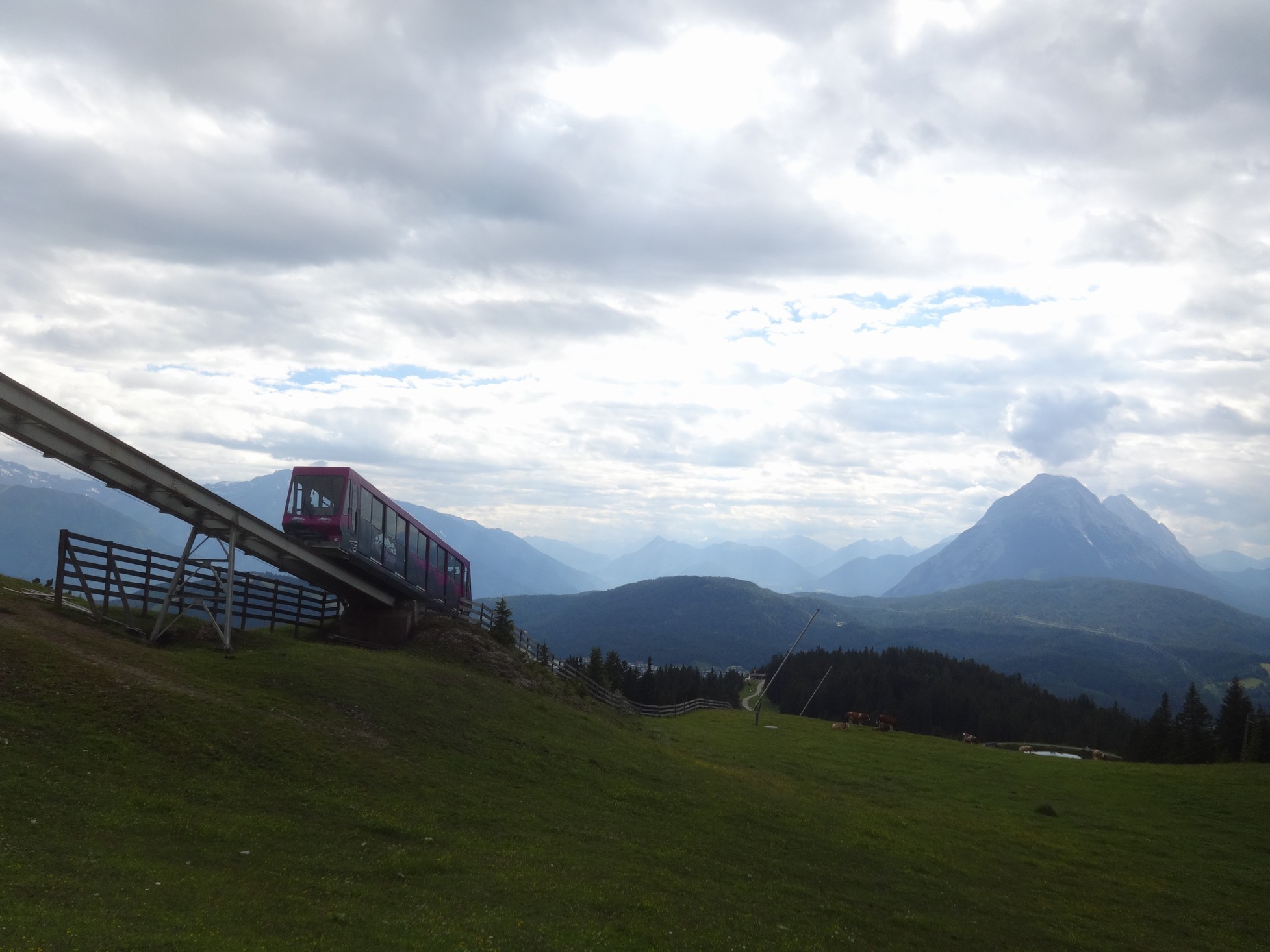 První lanová dráha je pozemní zubačka modročervené barvy, která se pomalu plazí po kolejích. Jízda je příjemná a brzy se začínají otevírat před člověkem kouzelné pohledy na okolní přírodu a především alpské vrcholky ve zdejším pohoří Karwendelgebirge.