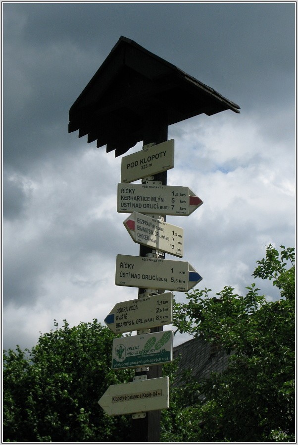 EDIT 2014: Červená značka je od roku 2013 vedená z Říček do údolí Tiché Orlice jinudy a změněna byla i další její tgrasa z Bezpráví do Brandýsa nad Orlicí. Zároveň došlo i ke zkrácení modré značky ve směru na Brandýs o cca 1,5 km proti údajům uvedeným na směrníku.