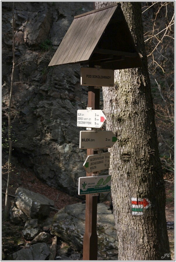 Rozcestník se nachází v údolí Doubravy přímo u lávky přes řeku pod skálou se zbytky hradu Sokolovec. Prochází tudy červená značka z Chotěboře údolím Doubravy do Bílku, Sobíňova a Pobočenskému rybníku a křižuje se zde se zelenou značkou z Bílku přes Sokolohrady, Čertův stolek a Horní Mlýn do Libic nad Doubravou a Modletín. Místem prochází turistická trasa popsaná na https://www.turistika.cz/trasy/sobinov-stikovska-lipa-a-udoli-doubravy-z-bilku.