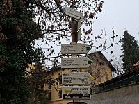 Turistický rozcestník u kostela sv. Martina ve Slatiňanech