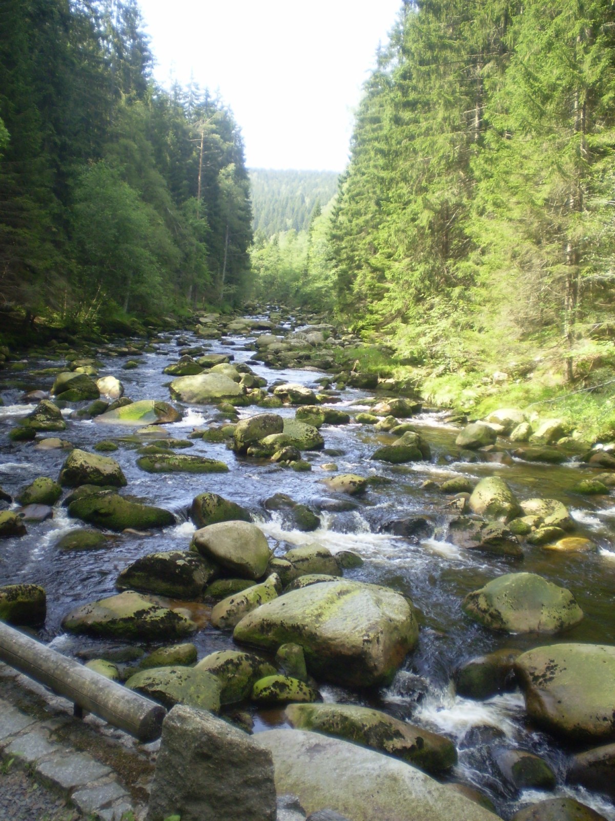 Kaňonovité údolí Vydry s peřejnatým řečištěm, obřími hrnci vymletými v žulových balvanech unášením drobného písku a štěrku proudem říčky.