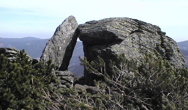 Skalní útvar Kamenné okno: Útvar se nachází na severním svahu červené hory a má výšku asi 3m