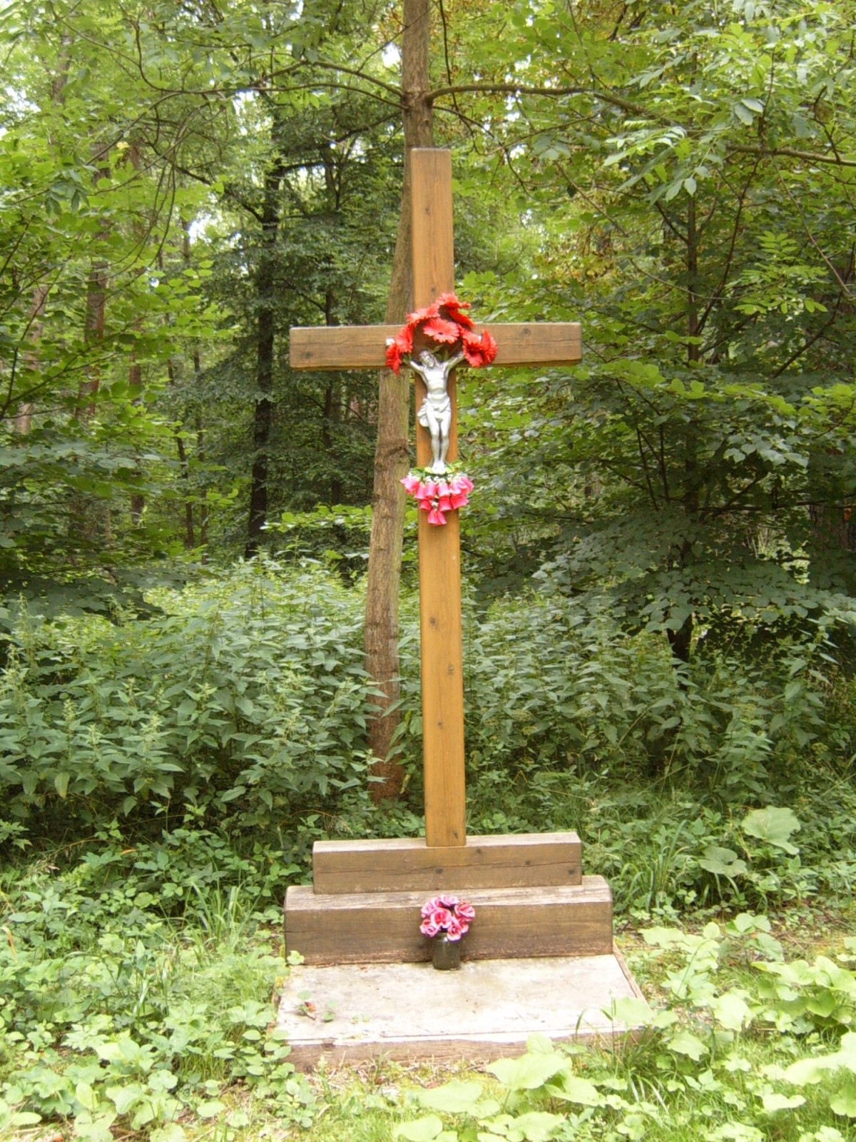 Zajímavý kříž, kdysi u něj bylo posezení, na lesní asfaltce vedoucí od rehabilitačního centra v Hrabyni do Mokrých Lazců. Kříž byl postaven na důležitém místě- výrazném rozcestí, kudy dnes vede několik cyklotras a červená značka z Hrabyně do Údolí Ohrozimy.