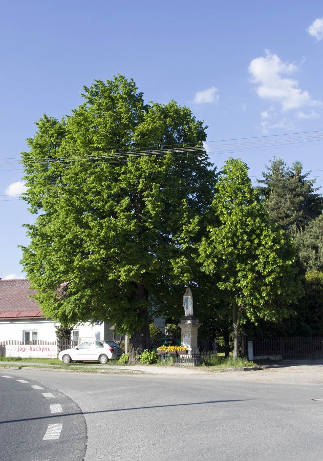 Ještě malý dodatek, úplně stejnou sošku ale asi jen o 170 cm menší měla babička z dolního konce Bludova, asi proto se mi socha ve stínu jedné vzrostlé a druhé nedorostlé lípy tak líbila.