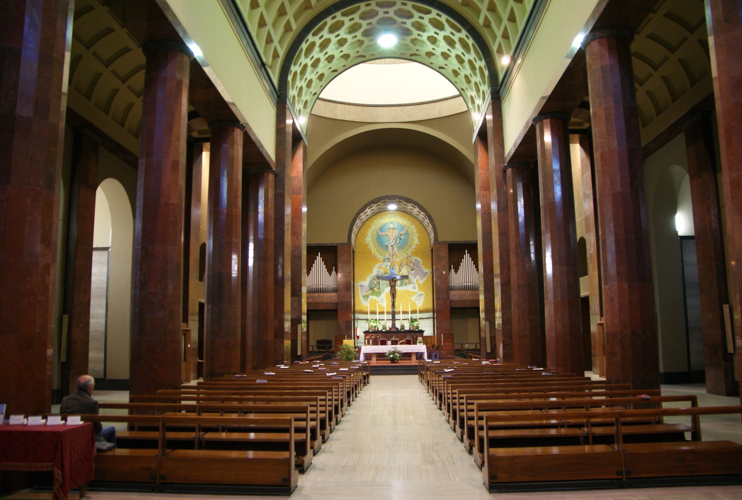 Chrám, sv. Mikuláše neboli Kostnice padlých je skutečně majestátní budovou s kopulí, zakončenou ve výšce 62 metrů (někdy se uvádí až 64 m) věžičkou se zlatým křížem (i když se jedná o památku takřka novodobou, tak i její vrcholová kopule byla poškozena při zemětřesení v roce 1976). Ctí podobu klasické křesťanské baziliky na půdorysu latinského kříže. Interiér dělí již zmíněné červené sloupy na trojlodí se 14 kaplemi. Za dominantu vnitřních prostor můžeme považovat umělecky hodnotnou bronzovou sochu Krista, dílo sochaře Aurelio Mistruzziho z roku 1939 a hlavní oltář – rovněž z červené žuly - s Mistruzziho postranními reliéfy. Po obvodu chrámu jsou umístěna zastavení cenné křížové cesty ze zlaceného bronzu, dílo milánského sochaře Gianni Castiglioniho z roku 1937. V centrální apsidě se pak nachází „zářící“ mozaika Vzkříšený Kristus. Její podobu navrhl v roce 1969 Fred Pittino a vzápětí ji zhotovila škola mozaiky Splimbergo. Pittinovy mozaiky zdobí také oba oltáře transeptu, a to oltář Nejsvětější svátosti (1958) a oltář Panny Marie z Providence 1961). Za prvním z nich se nachází „Znetvořený krucifix“, což je plastika poškozená v roce 1917 při dělostřeleckém útoku, za tím druhým Picciniho socha sv. Terezy.