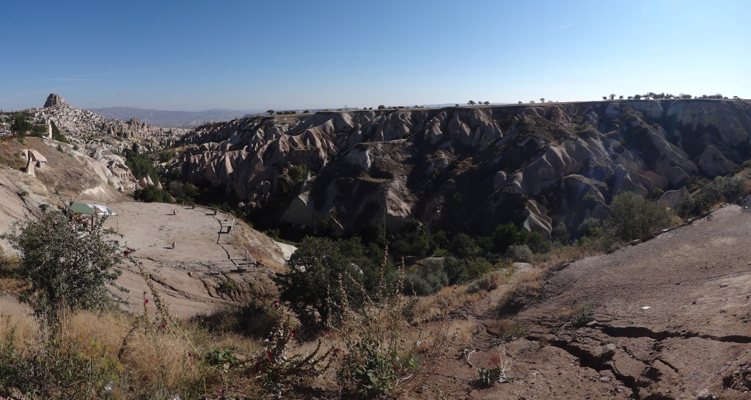 Již druhý den se pohybujeme v Kappadokii. Po noclehu v Ortahisaru jedeme do Uchisaru s krátkou "japonskou" zastávkou na fotografování v Údolí holubů (Pigeon Valley, Turecky Güvercinlik). Toto krásné údolí leží mezi Göreme a Uchisarem. Jak říkám, my se zde zastavili asi na 15-20 minut na fotografování a tak se díváme do údolí pouze shora. Údolí je pojmenováno podle tisíců holubníků vytesaných do tufových skal, jsou to ta malá hranatá okénka. Dříve se holubi chovali hlavně jako nositelé zpráv, později byli zdrojem potravy a hnojiva. Místní zemědělci používali holubí trus jako hnojivo hlavně na vinicích a proto prý jsou zdejší hrozny tak sladké. Asi jim nic neříká, že právě holubí trus je zdrojem různých nemocí a drobounkých "zvířátek". Na holuby jsme tento den moc štěstí neměli, bylo jich zde jen několik. Odtud jedeme do továrny na šití kožených oděvů (povinná zastávka, průvodce má provizi z prodeje), spojeno s módní přehlídkou a pak již hurá do Uchisaru.