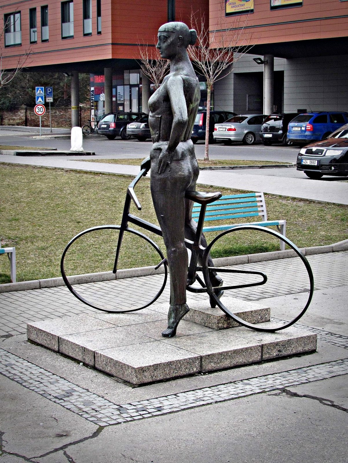 Tuhle zajímavou plastiku cyklistky v životní velikosti můžeme spatřit na Obchodní ulici poblíž uherskohradišťského autobusového nádraží, od nějž je vzdálena asi 50 metrů. Bronzová skulptura je umístěna na upraveném prostranství před supermarketem Albert naproti rezidenci Hradská. Projekt sochy vypracovala architektka J.Šimečková a do reálu jej roku 1988 převedl sochař Jiří Vlach.