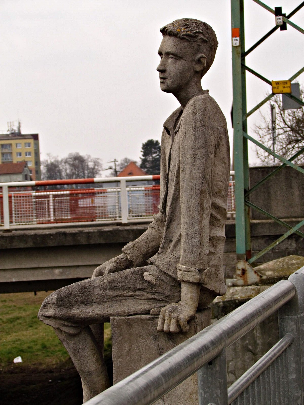 Na plastiku jinocha koukajícího na hladinu Moravy a sedícího přitom za zábradlím na kamenném soklu, narazíme hned za silničním mostem na Moravním nábřeží v místní části Rybárny.