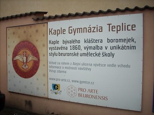 Hodně lidí projde okolo budovy gymnazia k nákupnímu středisku Billa, aniž by si všimlo, že jdou okolo kaple a to ne ledajaké…..Tato kaple skrývá beuronské umění a jak jinak,než že jeho původ pochází z německého Městečka Beuron, kde žili benediktíni od r.1863. Zakladatel beuronské školy byl Peter Lenz (1832-1928),jenž se vracel do období staré Byzance, Egypta a Řecka a používal jako vzor tzv.rovnostranný trojúhelník.Touto zvláštní metodou a při dodržování tohoto geometrického vzorce by měl k věřícím více promlouvat sám Bůh.