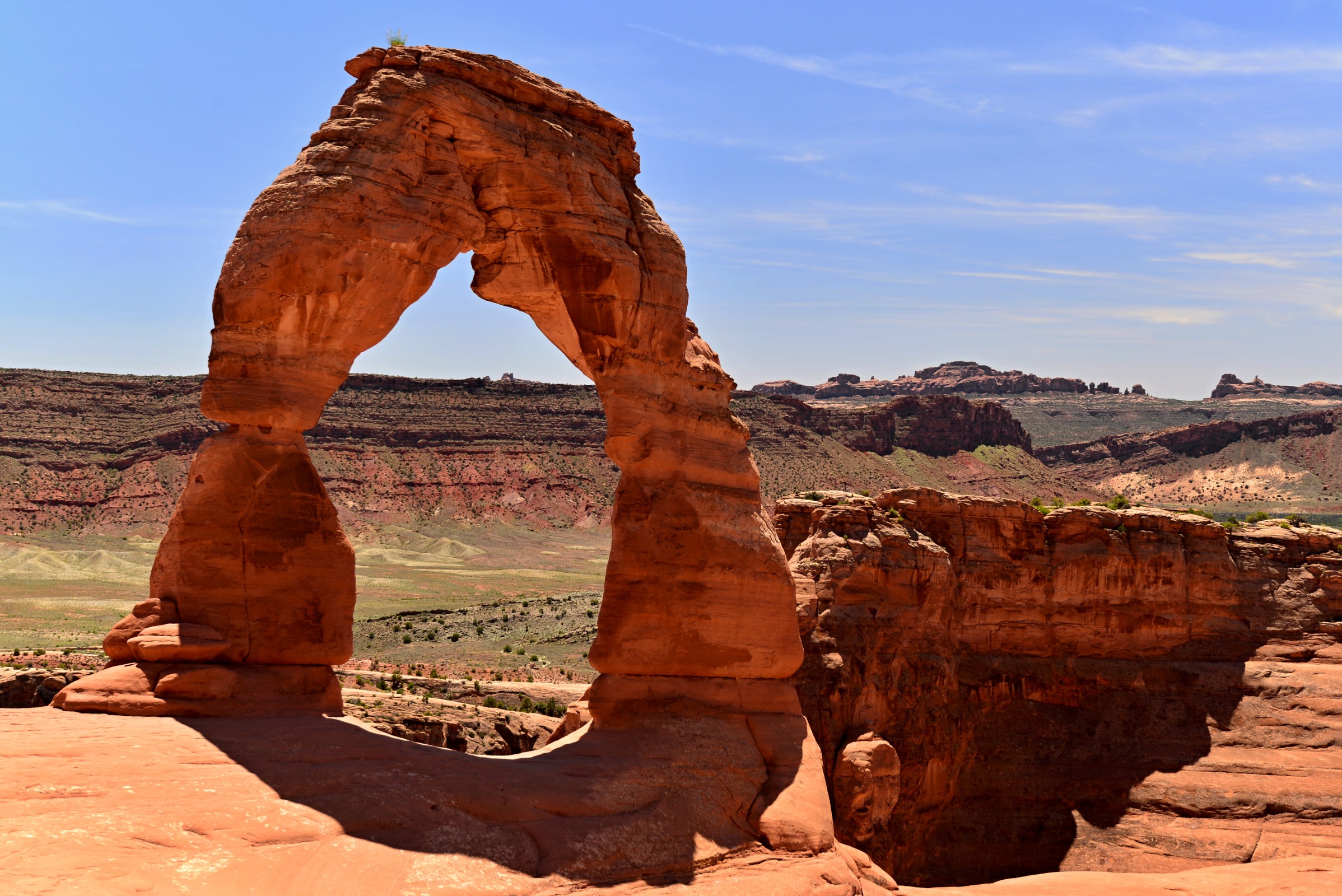 K Double Archu už nejdeme, musíme stihnout hlavní atrakci parku – Delicate Arch. Jedná se o nejznámější oblouk v parku a symbol státu Utah, který se objevil i na jeho SPZ. K oblouku se musí pěšky, cca 2,5 km jednosměrně, takže celkem tam a zpět 5 km. Parkuje se u Wolfe Ranch. To je taková dřevěná chalupa, ve které žil v 19. století nějaký John Wesley Wolfe a choval tu dobytek (tehdy tu možná byla nějaká vegetace).