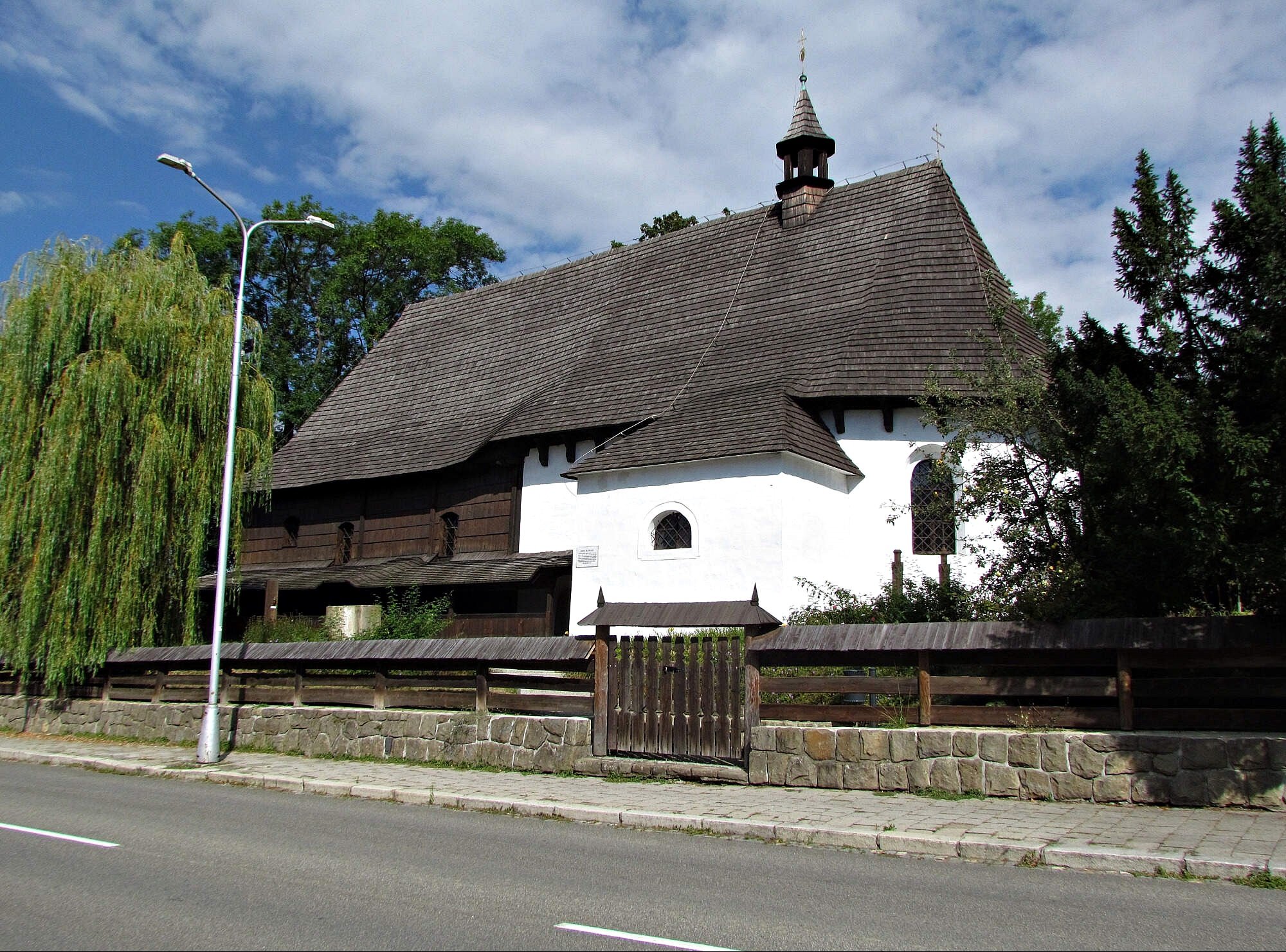 Kostel je ukončen zděným presbytářem se sakristií a kaplí sv.Kříže. Dřevěná chrámová loď je zvenčí lemována ochozem. Klenbu má v místě vchodu do lapidária jenom jižní kaple, zbytek tvoří plochý trámový strop. Kostel je kryt valbovou střechu se zcela novými šindely, jenž je obzvláštěna jen věžičkou sanktusníku.