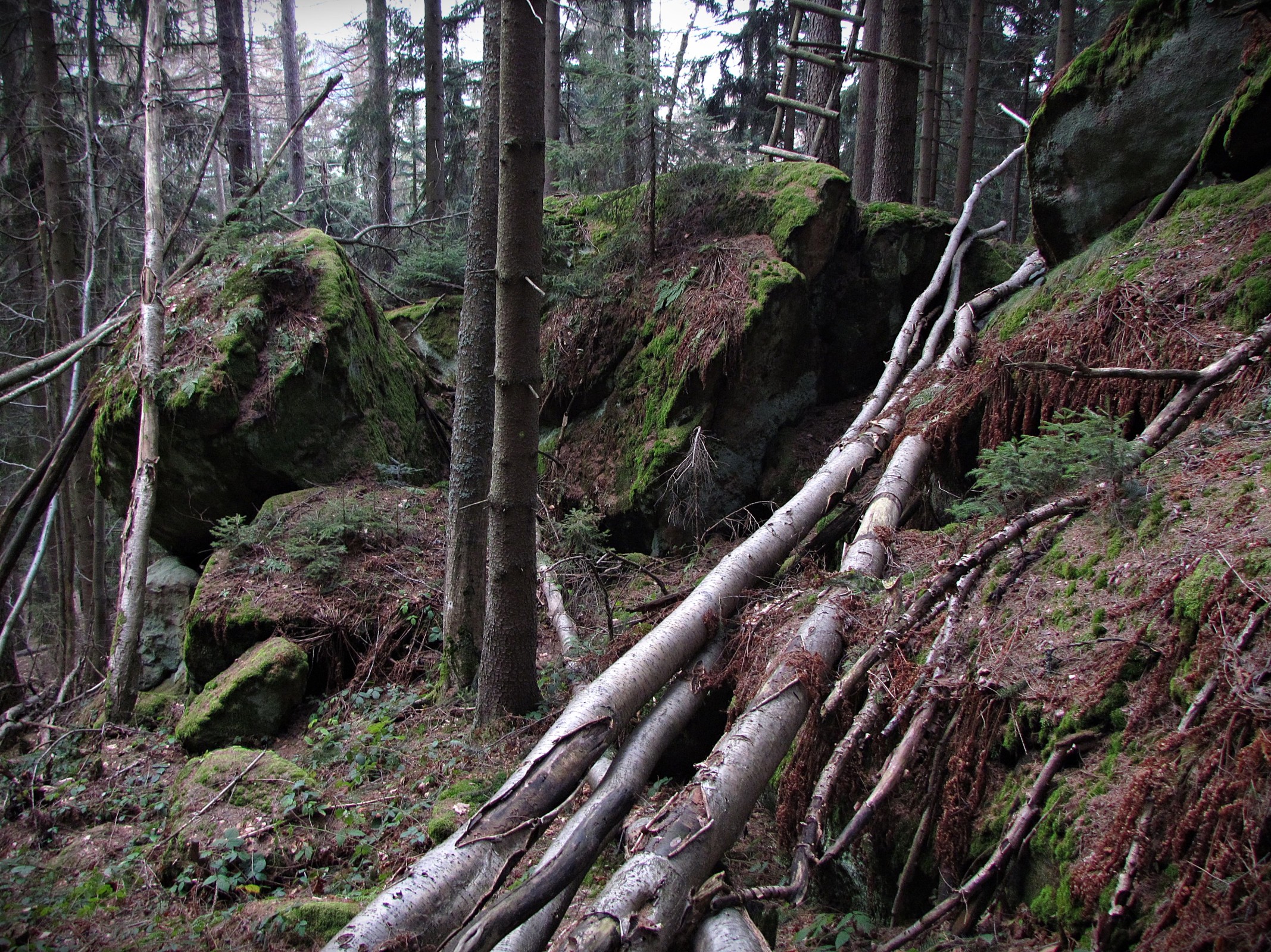 Jedním z nejvýraznějších skalních výchozů v této oblasti je shluk obřích balvanů a skalek, skrývajících se v zalesněném jihozápadním svahu vrchu Butorky. Nevede sem pochopitelně žádná značená trasa, takže je naprosto zbytečné k nim popisovat cestu. Případnému zájemci mohu doporučit jediné, toulat se od vrcholu už jmenovaného kopce dolů k říčce Senici rovnou za nosem... a pak na ně možná narazí! Skalky sice leží nad vrstevnicovou lesní cestou, těch ale svahy Butorek obkružuje větší síť, takže najít tu pravou je téměř zázrak. I já, když jsem před léty tyto skály "objevil," stalo se tak zřejmě na vyšší zásah zhůry, neboť jsem si při toulce lesním hvozdem zčistajasna pomyslel: "Panebože, mohl bys tady stvořit nejaké skaly"... I stalo se! Nad vidlicovitými roklinami, protknutými dvěma bystrými potůčky, a kterým mi Valaši odjakživa říkáme zmoly, najednou oko objevitelovo s potěšením popatřilo na zajímavé ukázce valašskosenické neživé přírody. Chaosovitý shluk skalních výchozů, a přes ně popadaná a ztrouchnivělá těla bývalých králů hvozdu, byla i přes ten celkový nelad velmi hezkou podívanou.