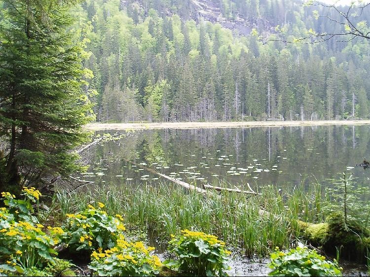 Břeh jezera: Klády ve vodě oddělují pravou část jezera pro lodičky od levé chráněné části.