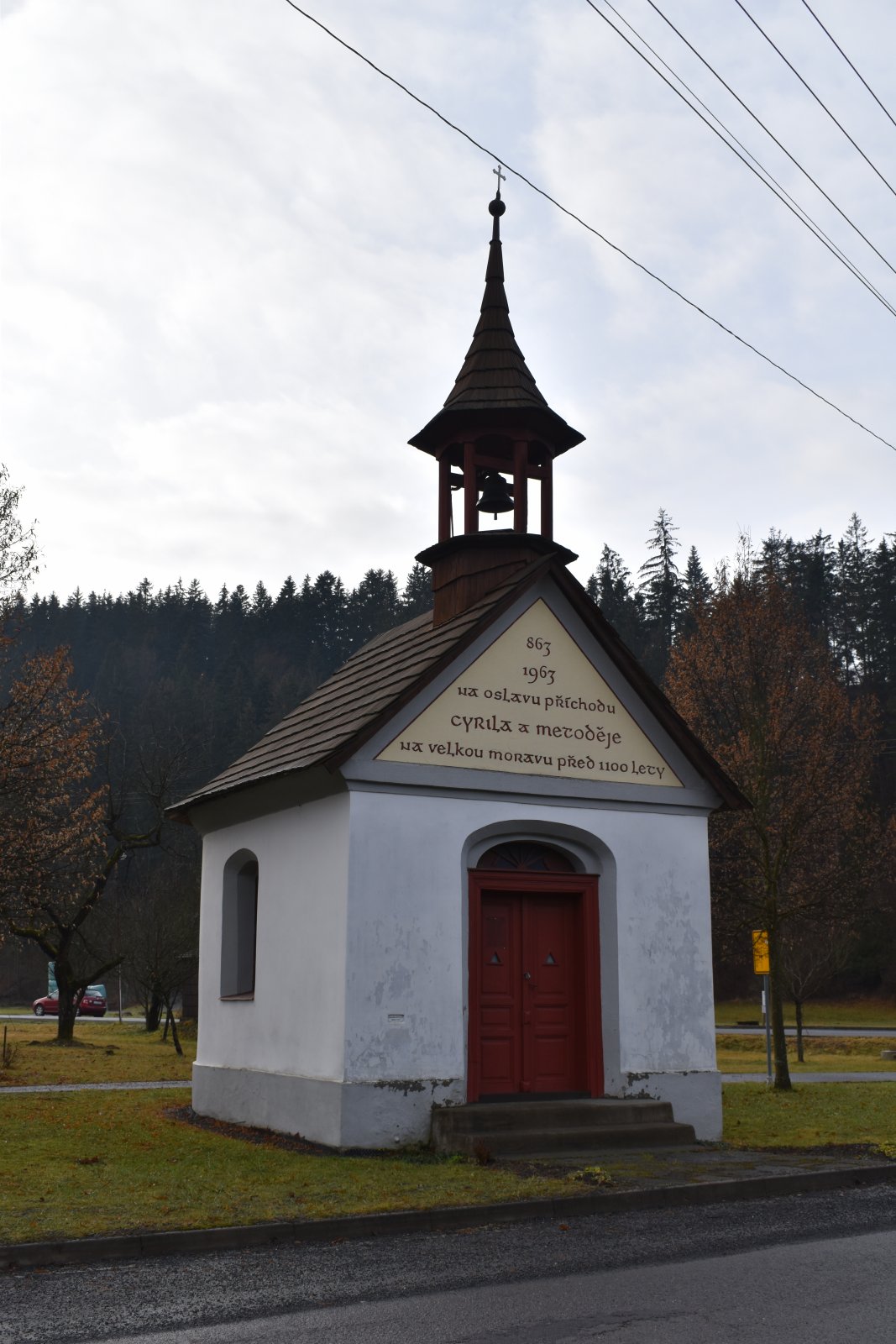Cestou do Velkých Karlovic sme uvideli pri ceste kaplnku s nápisom : 863 a 1963 NA OSLAVU PŘÍCHODU CYRILA A METODĚJE NA VELKOU MORAVU PŘED 1100 LETY.