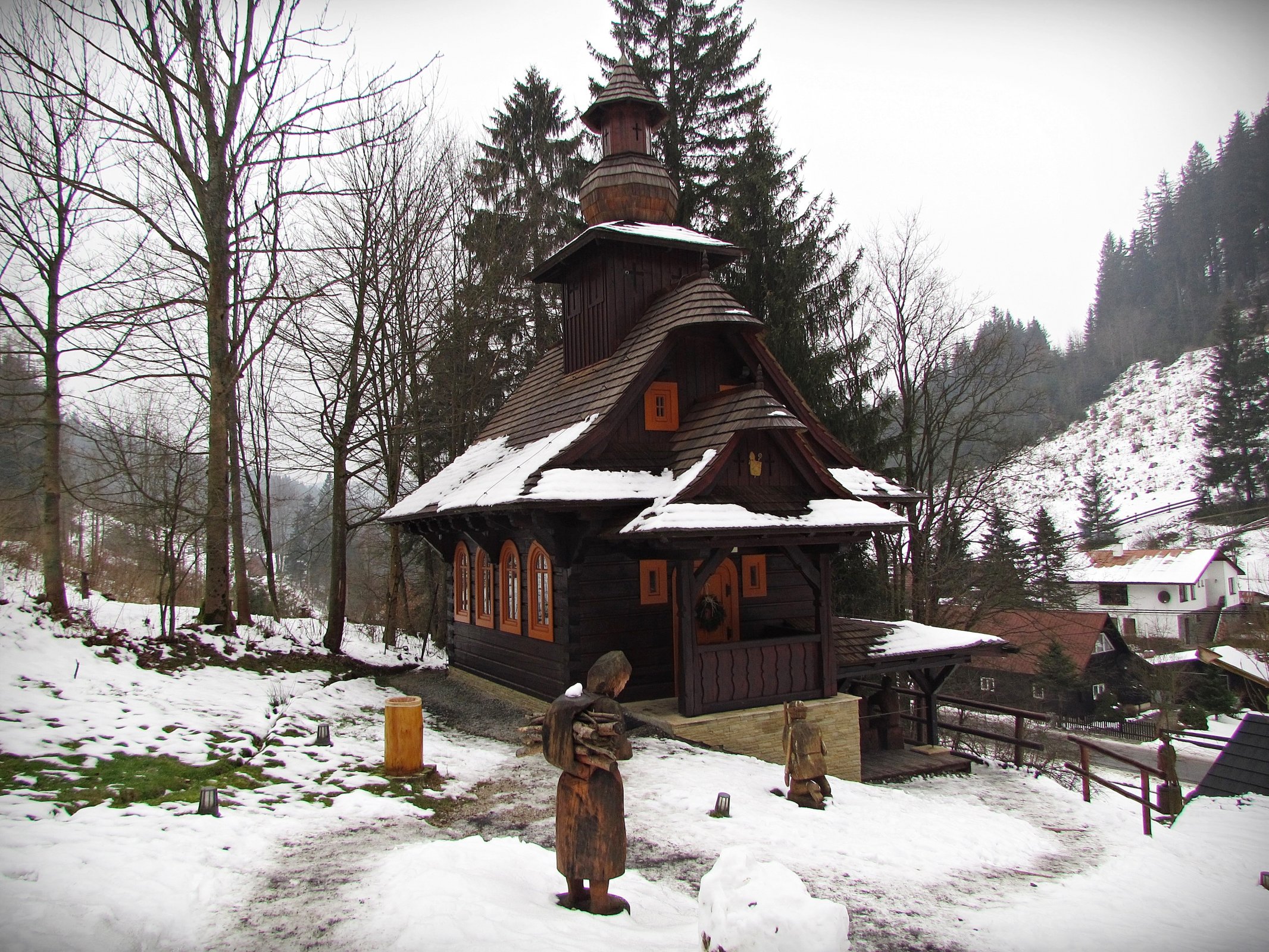 O volně přístupné galerii dřevěných soch v údolí Pluskovec, spadajícím do katastru Velkých Karlovic, jsem se už v roce 2013 na stránkách Turistiky zmínil. Nedávný víkendový pobyt v zimní valašské krajině ale zavdal popud, abych popis viděného podstatně rozšířil, neboť došlo k mnoha změnám, samozřejmě jen k lepšímu. V údolí vyrostly další nové penziony a roubenky, vystavěné ve valašském stylu. a do galerie u Betléma pod hospodou Kyčerkou přibylo díky dřevořezbářským sympoziím do galerie mnoho dalších soch, které znázorňují hudebníky či řemeslníky mnoha dnes už zapomenutých řemesel. Ale tím nejdominantnějším objektem v areálu se stala veliká a nádherná roubená kaple, zasvěcená patronu myslivců – svatému Hubertovi.