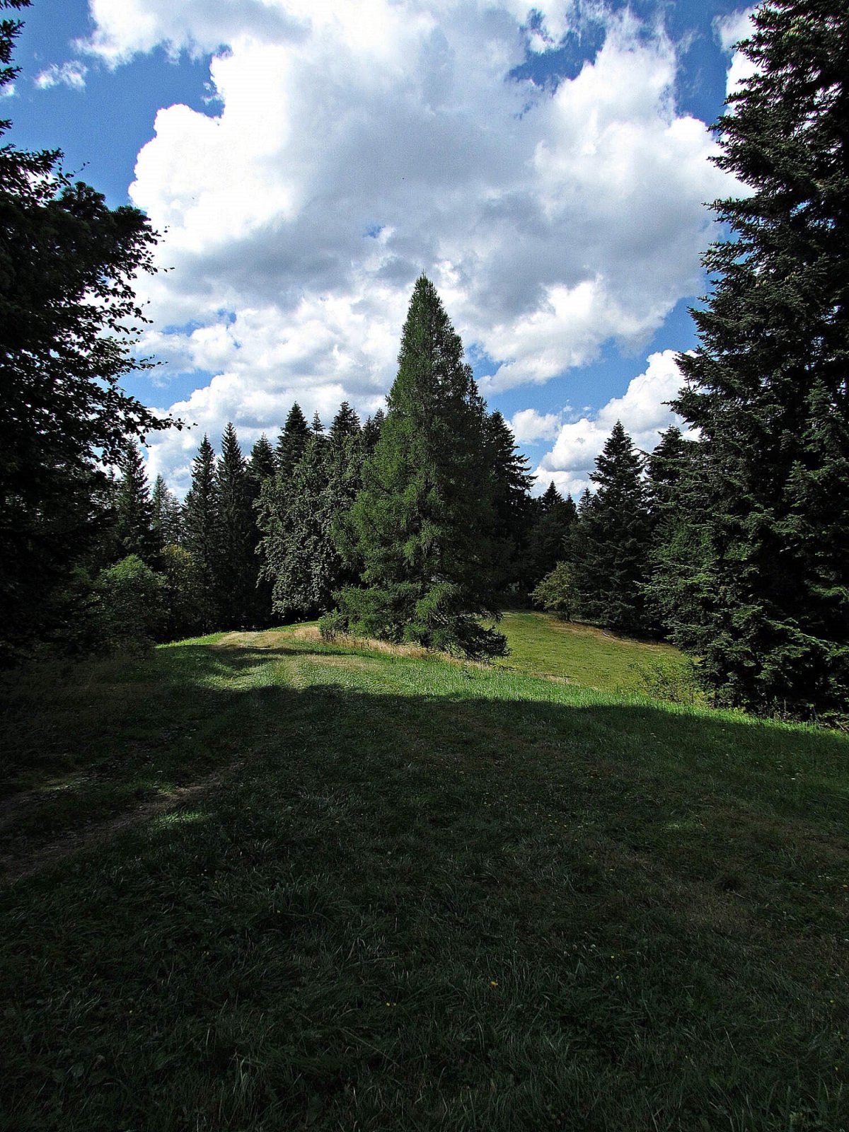 K přesunu ze sedla k Javorníčku jsem totiž zvolil cyklotrasu vedoucí hvozdem pohodlně po vrstevnici a ještě než jsem se napojil na žlutou značku, mohl jsem z horního konce jedné horské louky obdivovat výhled na starobylou dřevěnici pod sebou a nádhernou (bohužel velmi nepřehlednou) kulisu javornických vršků v pozadí… no a jen o kousek dál panoráma líbezné krajiny Velkokarlovicka. Krajiny zvlněné desítkami kopců s lesy, pastvinami, remízky, lukami či pasekářskými usedlostm a jejíž krásu nad protějším břehem Bečvy podtrhovala dlouhá hradba Vsetínských vrchů, nad níž už se tyčily nejvyšší vrcholky Beskyd.