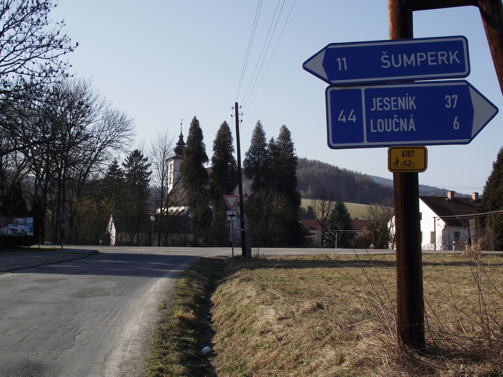 Přiložené fotografie jsem se pokusil nafotit tak, aby bylo podle polohy farního kostela sv. Jana Křtitele, probleskujícího za bezlistými dřevinami, zřejmé, že obě směrové tabule se skutečně nacházejí v těsné blízkosti. A pokud mi někdo přesto neuvěří, má možnost se na místě přesvědčit osobně …
