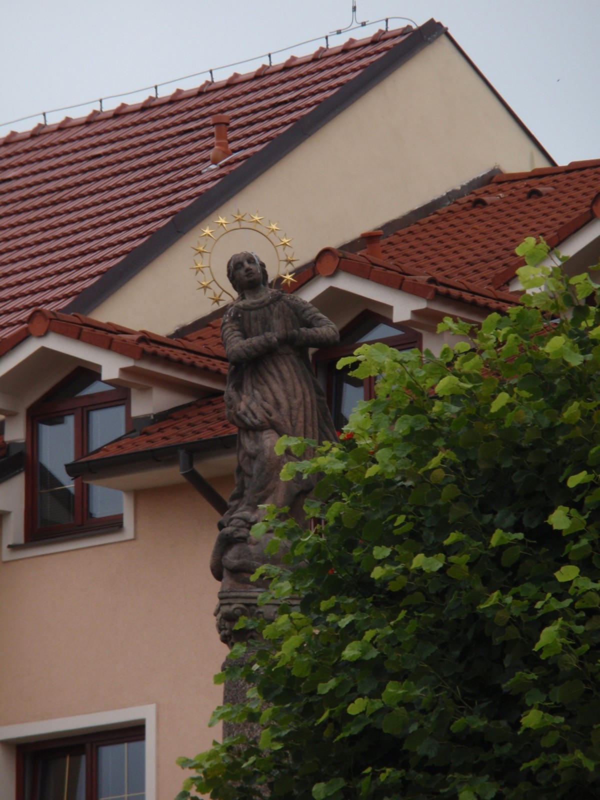 Ve velkomeziříčské Hornoměstské ulici jsou k vidění tři pozoruhodné barokní skulptury. Když jdeme směrem z centra, od náměstí, potkáme nejdříve sochu Panny Marie Immaculaty, osazenou na vysokém kamenném sloupu s datací 1724. Tento Mariánský sloup bývá někdy celkem bezdůvodně připisován zdejšímu sochaři Alexanderu Jelínkovi, avšak ten ve městě v době jeho vzniku patrně ještě nepůsobil - a navíc mu dílo ani stylově neodpovídá.