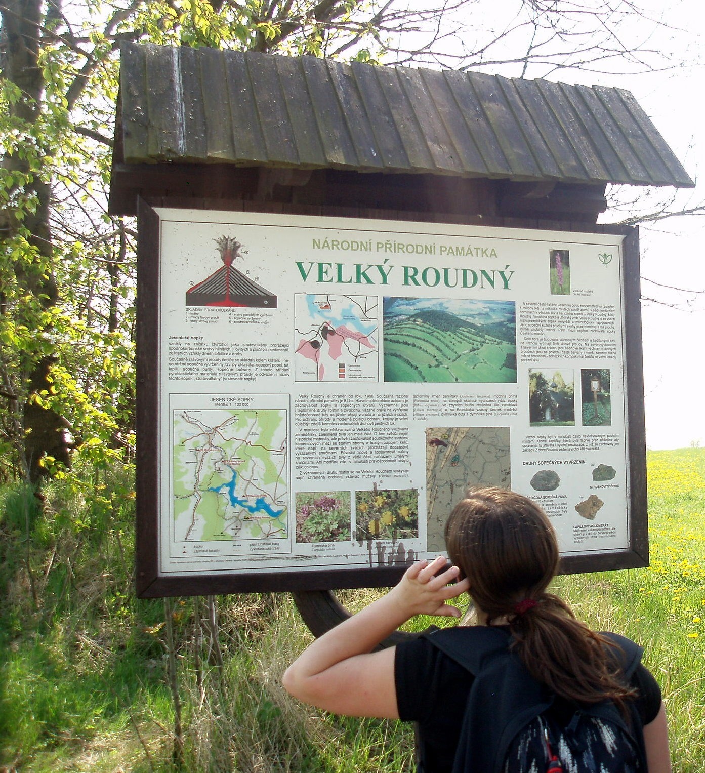 Nejvyšší sopku pohoří Nízkého Jeseníku s názvem Velký Roudný jsme pokořili během výletu v okolí Bruntálu. Auto jsme nechali u silnice vedoucí z obce Roudno a vydali se do prudkého stoupání k 1,3 km vzdálenému vrcholu. Těsně před vrcholem jsme odbočili do lesa, v němž se ukrýval Čertův kámen. Byl to velký tufový kámen vyvržený sopkou a rozpůlený na dvě části. Podle pověsti se za dávných časů, kdy ještě chodil Pán Bůh po zemi, usadili na Velkém Roudném čerti. Kolem sebe rozhazovali žhavé balvany a dštili síru. Navíc mezi lidmi šířili bezbožnost a prostopášnost a proto si zbožní lidé vymodlili příchod Pána Boha. Ten musel podstoupit boj se samotným vládcem pekla Luciferem. Oba se přetahovali právě na Čertově kameni, který bývá ale také nazýván po jeho soupeři. Po boji na kameni zůstal otisk boží nohy ( šlépěj napravo ) a škrábance vlevo od rohatého. Bůh zvítězil a mrštil ďáblem do země a za ním naskákali do díry všichni čerti. Tato díra má být původním jícnem sopky těsně pod vrcholem, kterou lidé pro jistotu zaházeli balvany a kamením, aby čerti již nevylezli. Kámen jsme si prohlédli, děti si na něj vylezli a vyfotili se na něm a pak jsme se vrátili na cestu a po pár metrech došli na malý palouk s kapličkou a rozhlednou.
