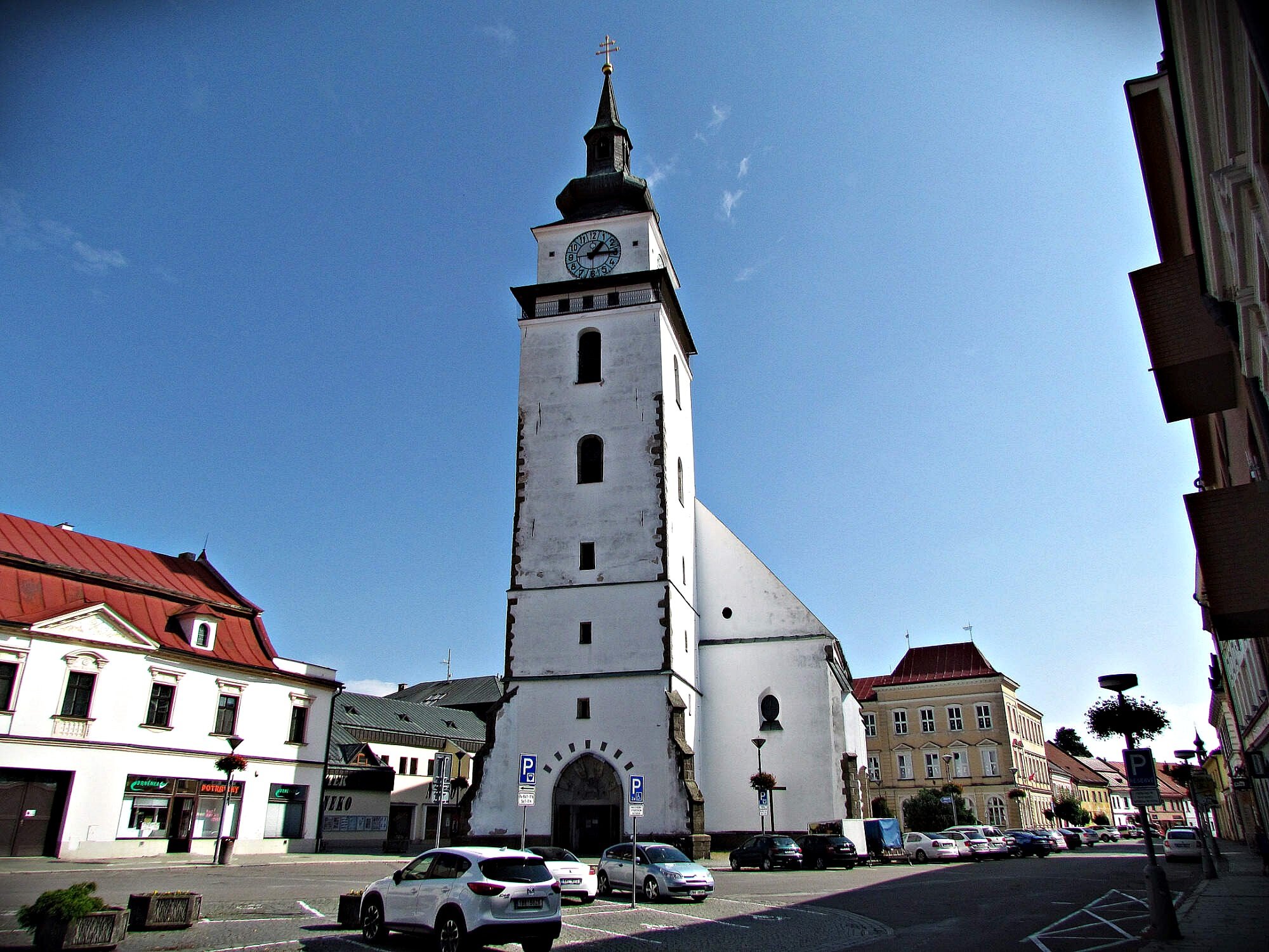 Symetrickou a velmi sympatickou protiváhu tvoří velkomeziříčské radnici na protější jižní straně hlavního náměstí rovněž bělostné, ale pro změnu sakrální stavení. Je jím kostel sv.Mikuláše postavený zde již ve 14.století. Jeho „životopis“ by vydal na tlustou knihu, neboť chrám byl mnohokrát přestavován či stavebně upravován. Hlavním poznávacím znamením kostela je jeho vysoká hranolová věž tyčící se přímo nad rynkem, v jejímž přízemí byl roku 1883 do interiérů proražen nový hlavní vchod. Předtím se do nich vstupovalo jinudy.