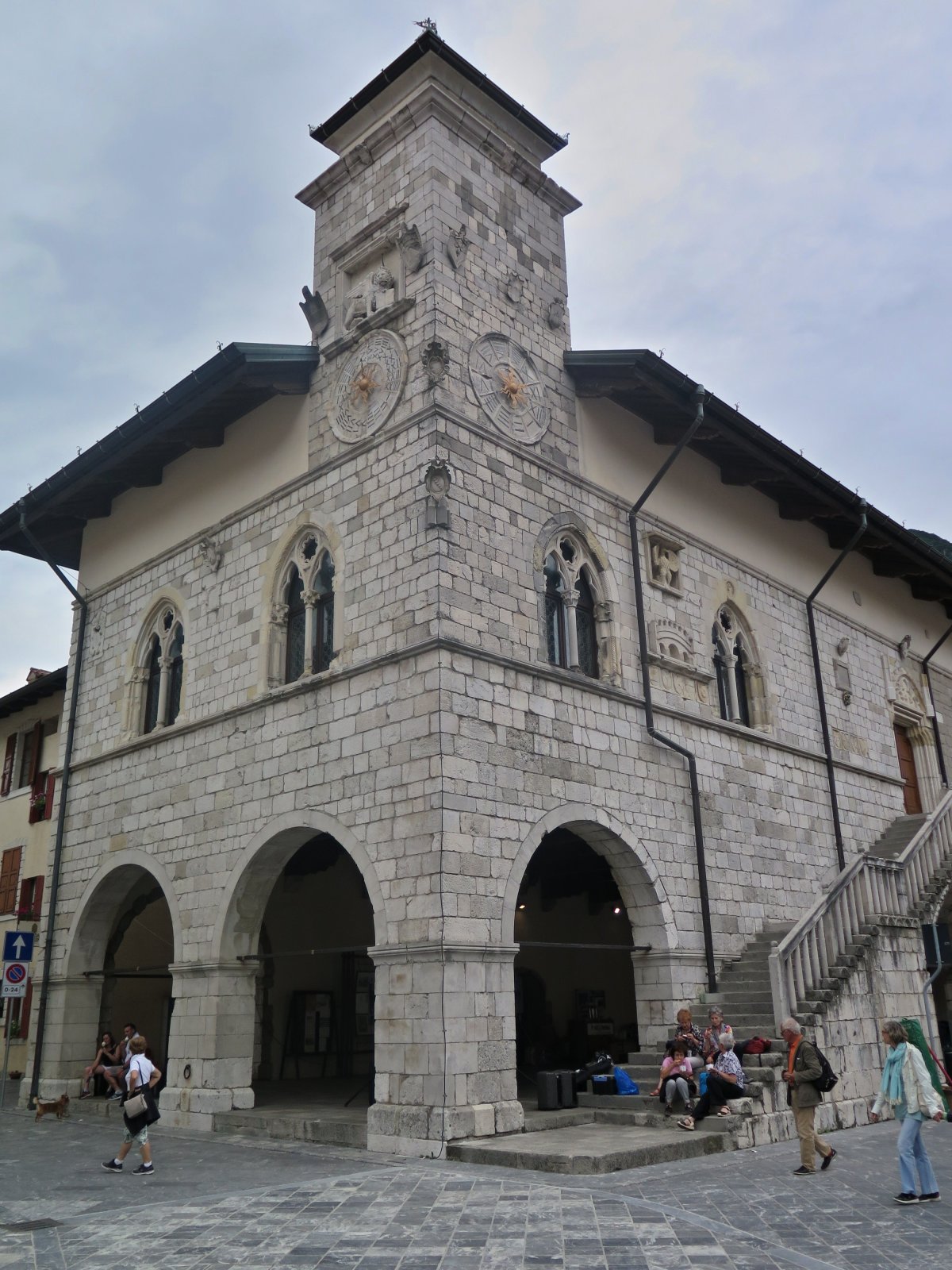 Impozantní radniční budova má dvě části - dolní otevřenou lodžii a horní palácovou část s krásnými dvojitými gotickými okny, která je přístupná po velkém venkovním schodišti. Při vstupu do lodžie každého jistě nejvíce zaujmou dochované fresky na zadní stěně, které vytvořil Pomponio Amalteo. Zajímavý je i – částečně malovaný – dřevěný strop. Nárožní věž pak zdobí nejen hodiny, ale také reliéfní skulptura lva svatého Marka, která je symbolem období benátské nadvlády v tomto regionu. Vnější fasádu zdobí také erby místních šlechtických rodů.