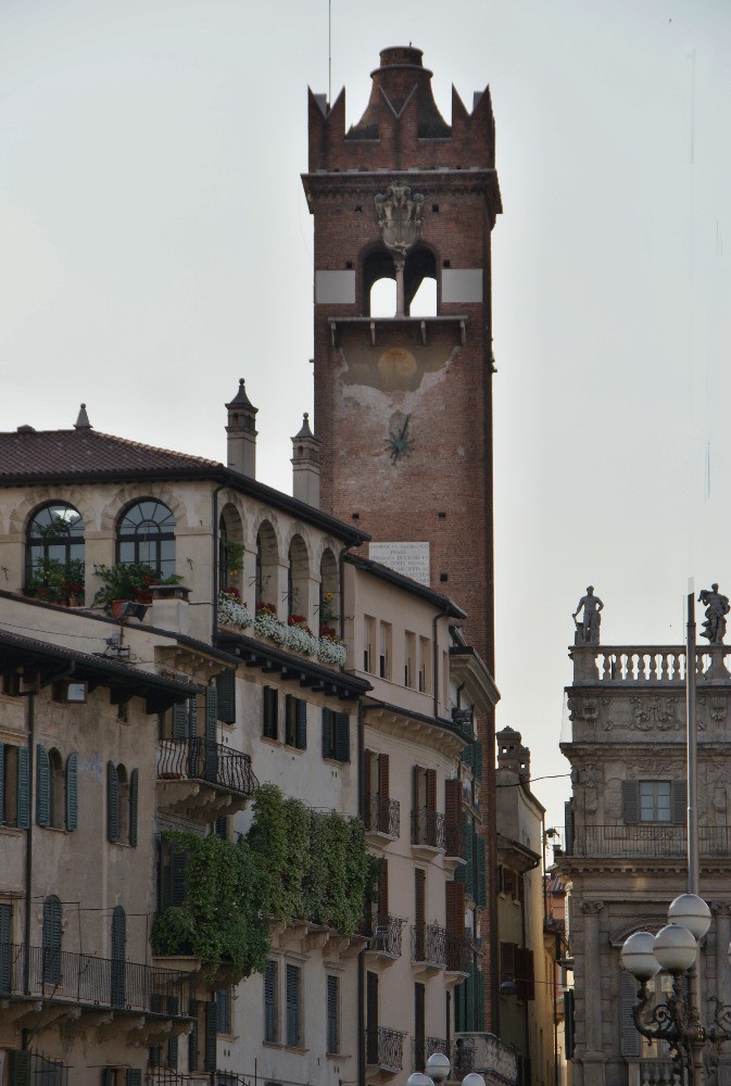 Významnou veronskou památkou je také vysoká cihlová věž Gardello, nacházející se na severozápadní straně náměstí Piazza Erbe a pocházející z období 12., 13. a 14. století. To sice znamená, že původně byla postavena již dávno před nástupem vlády rodu della Scala, ale Cansignorio ji nechal v roce 1363 upravit Giovannim da Ferrara, aby zde byl o dalších sedm let později osazen zvon, odbíjející každou celou hodinu. Jednalo se tehdy o první veřejnou „časomíru“. S největší pravděpodobností je do zvonice v roce 1421 osazen poměrně složitý mechanismus a „hodinová věž“ se stává ukázkou dalšího vítězství technického pokroku. A hned na úvod si můžeme ještě prozradit, že starý zvon, vážící 1.800 kg, je dnes součástí expozice muzea v Castelvecchio nebo že od vedlejšího domu byla věž zcela oddělena teprve v roce 1932.