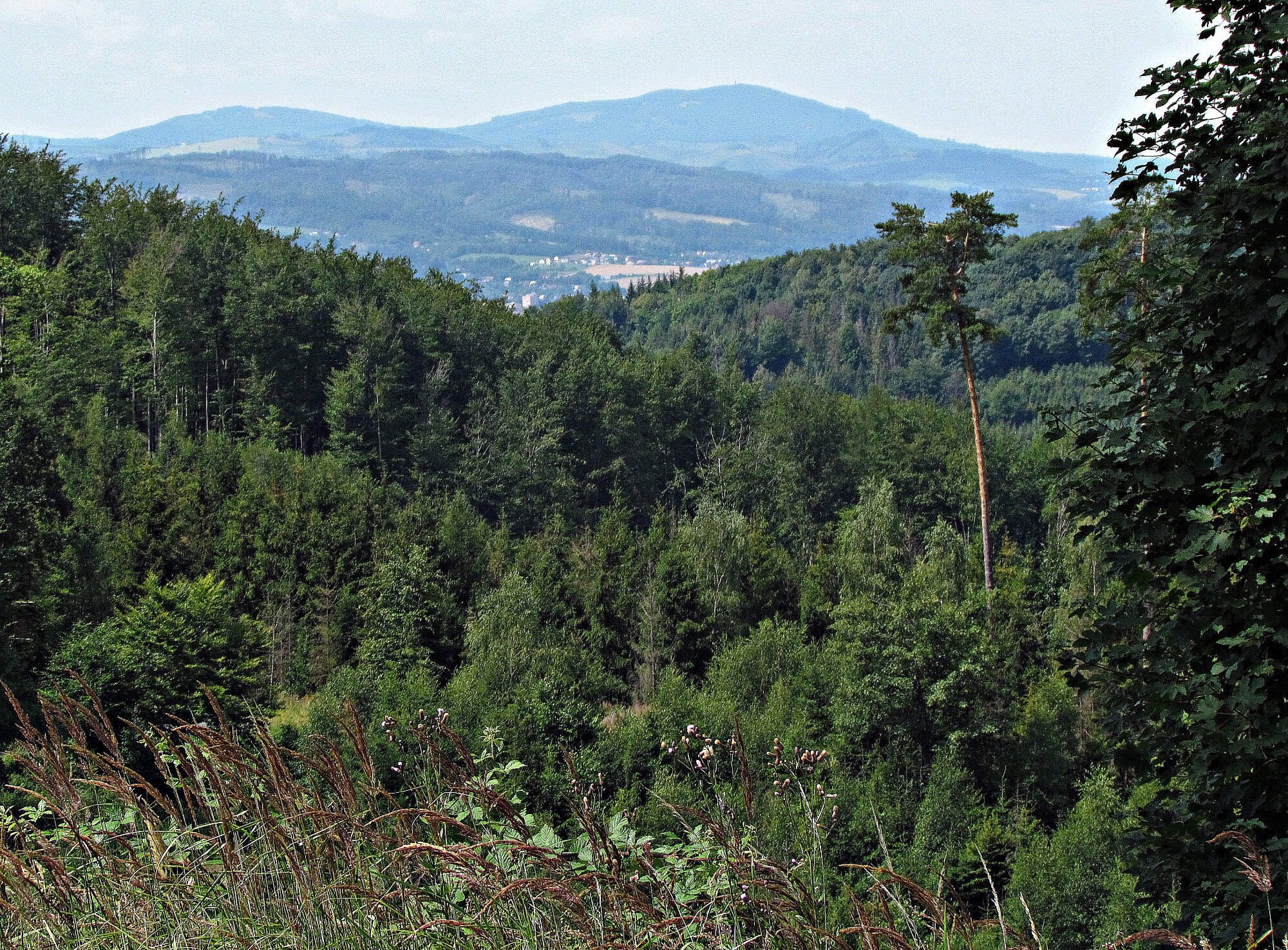 O něco výš jsem se ocitl ve vlastním sedle pod Oklukem, odkud se mi nejprve směrem k jihu nabídl pohled na dosud zalesněný kužel Ostrého vrchu (641 m). Jen o pár desítek metrů dál se ze silničky otevřel panoramatický průhled směrem k západu, jemuž mezi svahy Veřovických vrchů a za sníženinou s Bečvou a Valmezem na obzoru dominovala impozantní masa Kelčského Javorníka korunovaného rozhlednou (866 m), nejvyšší to kóty Hostýnských vrchů.