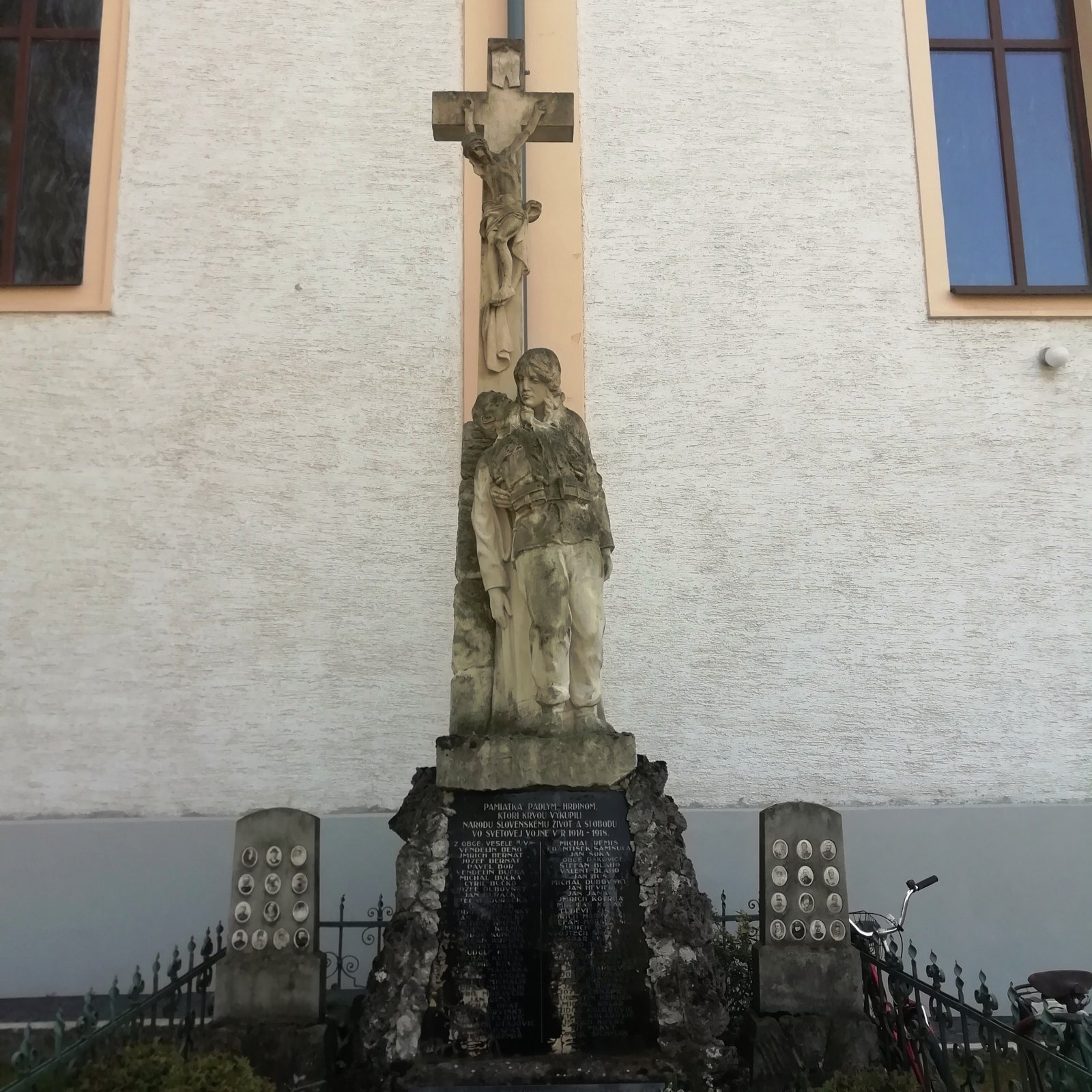 Pod väčšou doskou je ešte jedna menšia, sú na nej vytesané mená obetí druhej svetovej vojny s nápisom Padlí občania našej farnosti za druhej svetovej vojny v rokoch 1941 - 1945. Po stranách strednej hlavnej časti pomníka sú ďalšie dva kamenné pomníčky, na ktorých sú v oválnych rámčekoch bezmenné fotografie tých, ktorí sa z frontu domov už nevrátili. Hrozné je, že na vojnu museli narukovať aj strašne mladí muži, v detaili je fotografia ešte chlapca. Okolo pomníka je kovový ohradný plotík. Pomník je postavený v centre obce pred severnou časťou kostola svätého Bartolomeja.