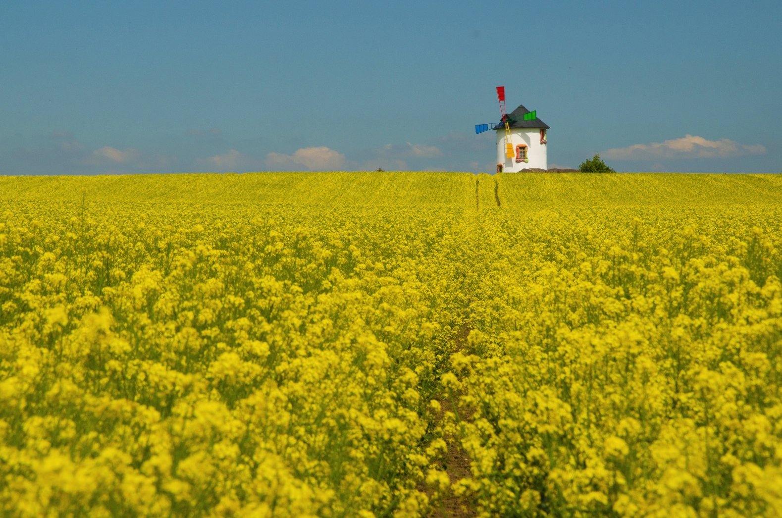 Na nový větrný mlýn je nejhezčí pohled z polní cesty, která obchází návrší s mlýnem a spojuje silnici od Librantic se silnicí od Slatiny.