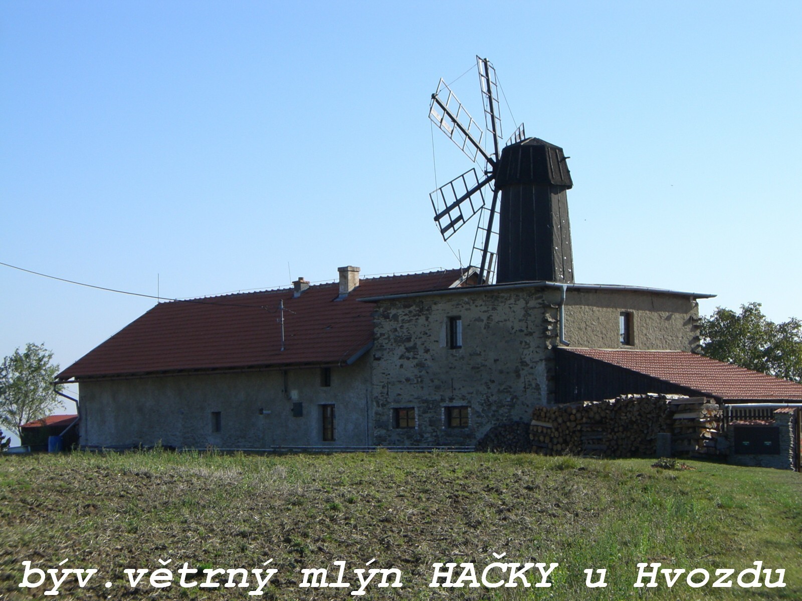 Malá víska Hačky,sama osobě zajímavá až na kapličku a památník není.Poblíž ní,ale stojí velice pozoruhodný větrný mlýn..Větrný mlýn ve své dnešní atypické podobě vznikl v letech 1922 – 23. Jeho předchůdcem byl dřevěný větřák z roku 1826, který v roce 1911 vyhořel. Současný objekt, postavený asi na stejném místě, představuje svérázný produkt, sestrojený patrně podle vlastních plánů zručného a fantazií vybaveného vesnického řemeslníka a stavitel.