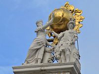 Na dvou hlavicích bočních sloupů je datační nápis (římskými číslicemi 1732) a mezi nimi se nachází císařská orlice s vídeňským městským znakem na hrudi. Na vrcholu bosované čelní stěny je čtvercová základna s latinským nápisem (Imperante Carolo VI. instauravit SPQV). Na tomto podstavci stojí dvě postavy, které představují Statečnost a Nezlomnost. Ty společně nesou zlatý globus se dvěma propletenými písmeny C a číslem VI.