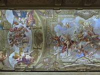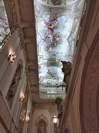 Na schodišti, které zabírá téměř celou délku levého bočního křídla prvního nádvoří, postupně uvidíme busty císařů Caesara a Tita Flavia Vespasiana, jedenáct soch římských božstev ve štukovaných výklencích a čtyři skupiny putti hrajících si nebo bojujících na kamenném parapetu (některé jsou držákem na lucerny). Cyklus soch na schodišti je dílem Lorenza Mattielliho, ale putti zřejmě vytvořil Joseph Kracker. Velká nástěnná zrcadla na schodišti byla instalována až po roce 1907.