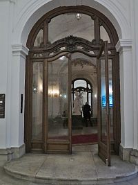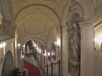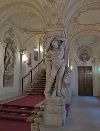Vstupní trojlodní část zdobí velké Krackerovy plastiky ve výklencích a štuky (snad Alberto Camesina). Zaujme oválná široká předsíň s kopulovým stropem, pilastry a dórskými sloupy. V levé části najdeme vstup k velkému schodišti, které je považováno za jedno z nejkrásnějších ve Vídni a kterému dominuje Herkules z dílny Lorenza Mattielliho coby vzdání pocty císaři Karlu VI.