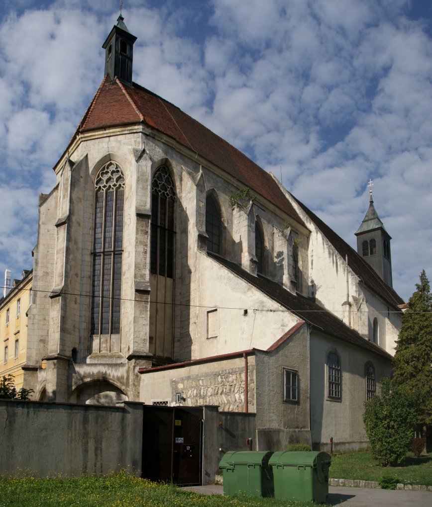 Zmíněná rekonstrukce byla nutností. Celá dominikánská bazilika s dlouhým chórem totiž utrpěla těžké škody při požáru města v roce 1433. Následující rok již klášter patřil cisterciákům, v roce 1452 byla znovu zaklenuta chrámová loď a roku 1453 byl kostel rozšířen dvojčlennou skupinou kaplí (kaple sv. Barbory a kaple Svatého Kříže) směrem na západ. S tehdejším rekonstrukcí jsou nejvíce spojována jména císaře – zakladatele Fridricha III. Habsburského a významného stavitele polského původu Petera von Pusika.