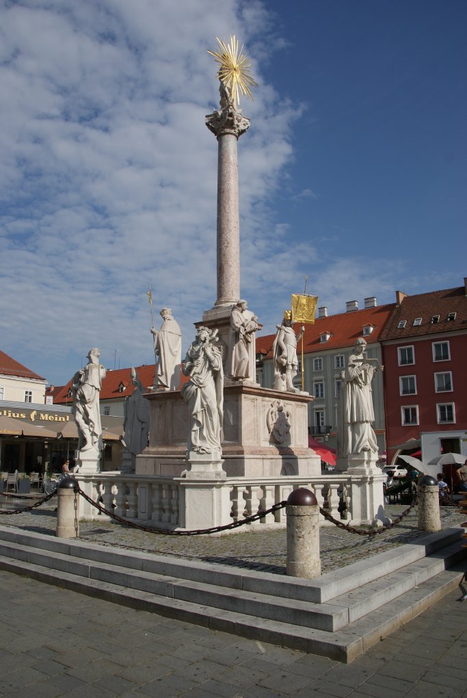 Zdejší morový sloup se nachází na Hlavním náměstí (Hauptplatz), je poměrně vysoký a pilířový. Kromě vrcholové Immaculaty jej zdobí od počátku – tedy od roku 1678 – čtveřice soch světců v rozích reliéfy zdobeného podstavce. Jedná se o Jana Křtitele, Floriána, Antonína z Padovy a Leopolda. Mezi nimi vyrůstá sloup z růžového (nebo červeného) mramoru, na kterém „trůní“ Neposkvrněná Panna Marie, držící v náručí svého syna. Za zádý má „zlatý paprskový kříž“. Na tomto památníku najdeme také pozlacený erb zdejšího biskupa - a pozdnějšího kardinála – Leopolda hraběte Kollonitsch nebo kříž jeho „domovského klubu“, tedy Řádu maltézských rytířů.