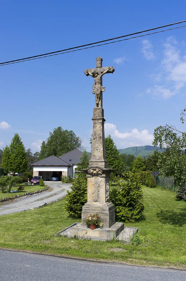 Kamenný kříž je celkem tradičně vytvořen ma čtvercovém základu s nižším soklem, na jehož čelní straně poměrně dobře přečteme, že krucifix nechal postavit jistý Johann Rotter a že se tak stalo v roce 1832.