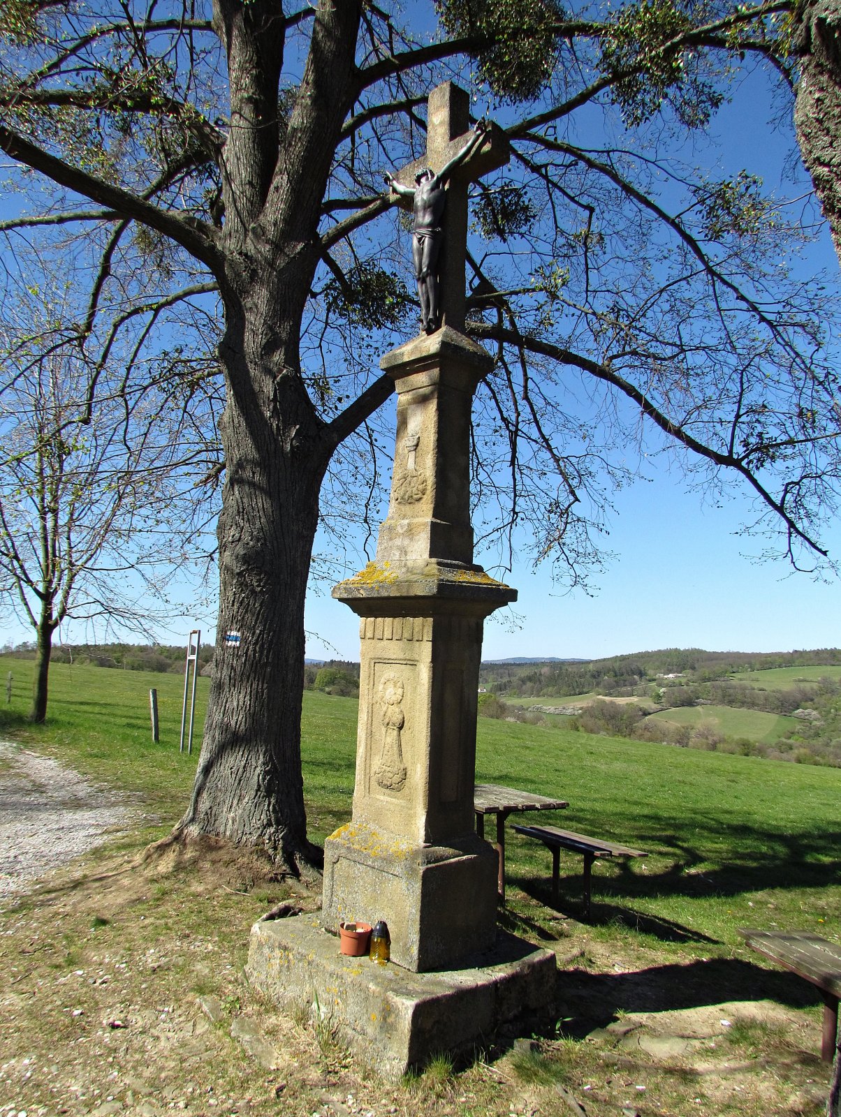 Je třeba počítat s tím, že to úvodní prudké stoupání v délce půl kilometru přes okrajovou část Těchlov dá vašim kolenům asi pořádně zabrat, ale pak přichází zatáčka vpravo a stoupání se zmírní. Zároveň se nad pastvinami na pravé straně cesty otevřou už ničím nerušená hezká panorámata a ke kříži, u něhož je možnost posedět a odpočinout si u dvou stolů na lavičkách, už je to jen asi 250 metrů...