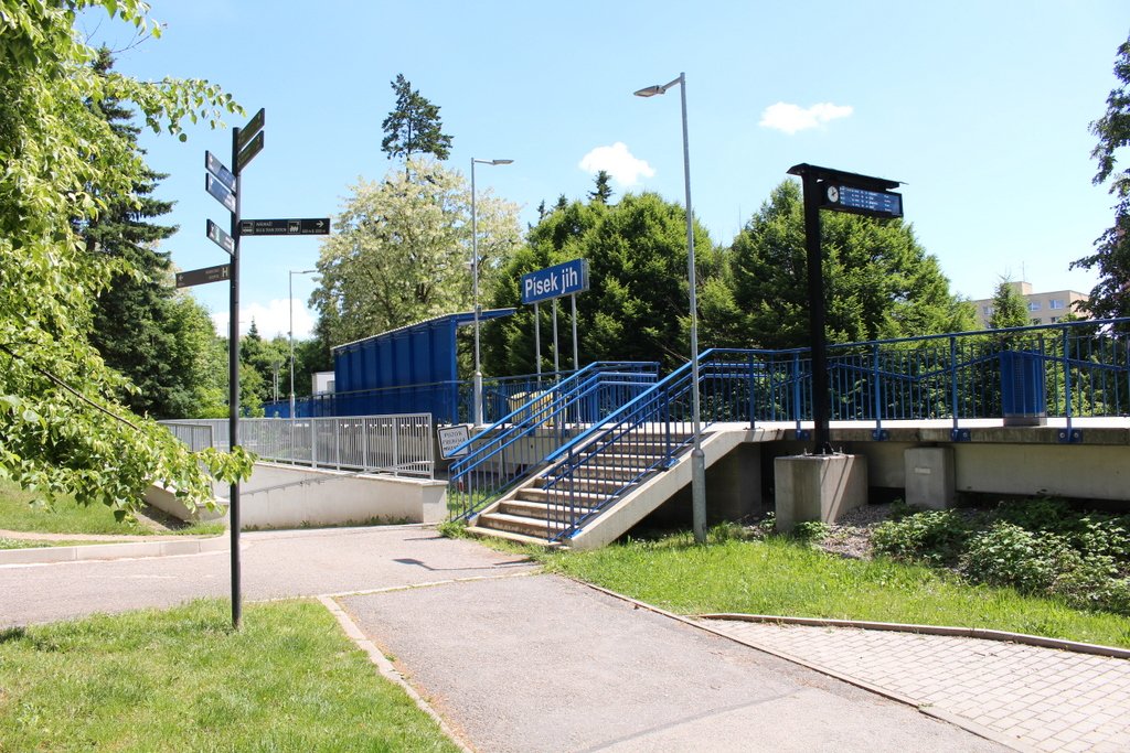 Písek patří k městům, kam se rád vracím a dopravním prostředkem je vždy vlak. Před cestou jsem hledal spojení a k mému překvapení jsem zjistil, že má město novou vlakovou zastávku, ze které je to nejblíže do staré části města. Byla postavena nedaleko jižního sídliště na trati číslo 201 z Tábora do Ražic. Z informace o zastávce se dozvídám, že tady vlaky začaly zastavovat v prosinci v roce 2019. Délka nástupiště je 90 metrů. Je zde přístřešek pro cestující s lavičkami, elektronická informační tabule, rozhlas a veřejné osvětlení. Pod tratí je podchod z města na sídliště. Trochu mě překvapila konečná cena 25,8 milionů Kč. Jezdí tudy spěšné vlaky ze Strakonic do Tábora a osobní vlaky z Tábora do Ražic v dvouhodinových intervalech. Do středu města se odtud projde ulicemi Heritesovou a Otakara Ševčíka za necelých deset minut.