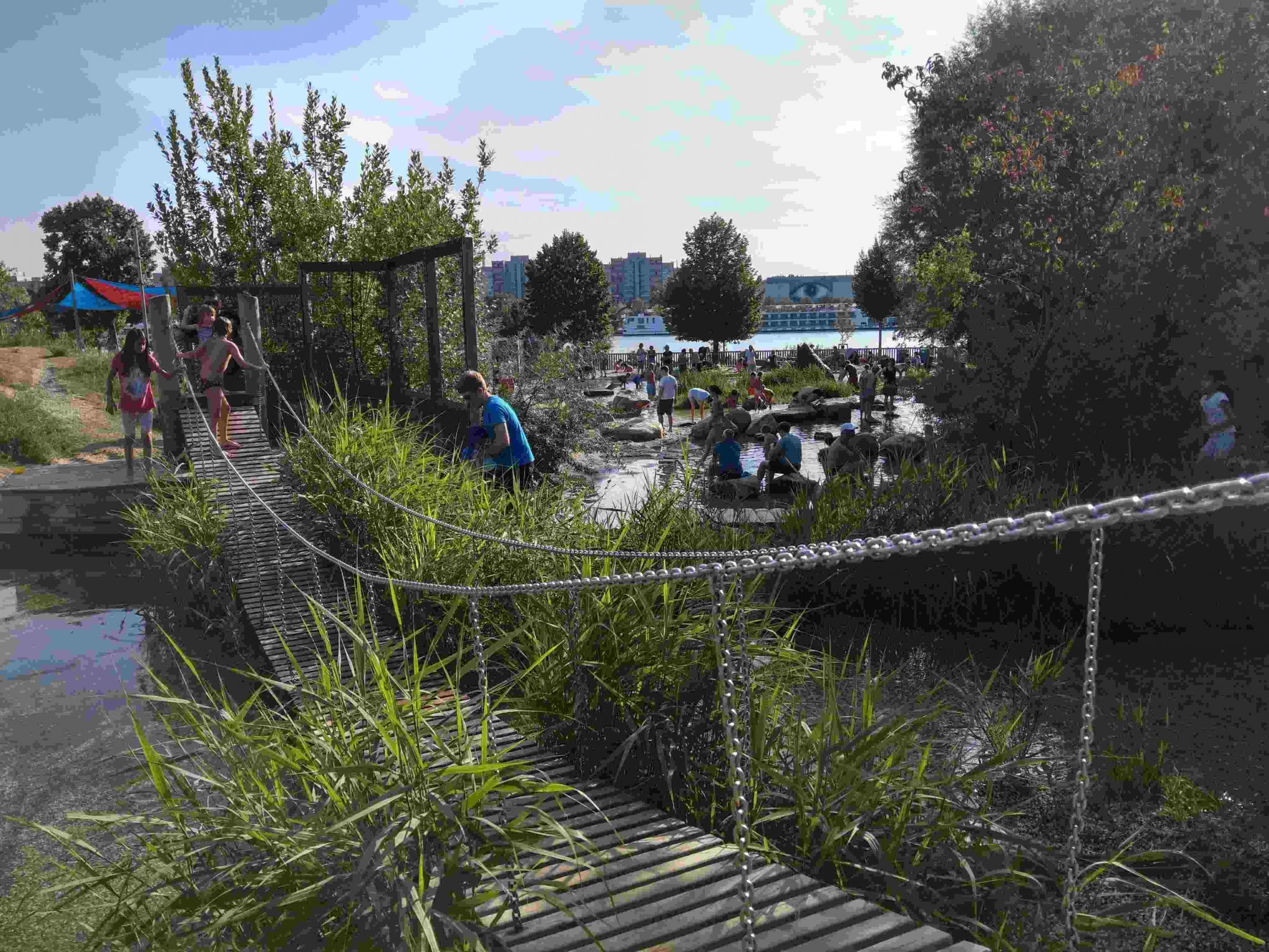 Vodné ihrisko pre deti –Wasserwpielplatz nájdete kúsok od mosta Reichsbrücke priamo na ostrove Donauinsel. Areál je bezplatný, otvorený je od mája do septembra. Nájdete tu viacero vodných atrakcíí, vodné jazierka, potok s mlynom, vodopád, ručnú kompu, sochu kapra s vystrekujúcim gejzírom, pieskovisko, vodné fontány.