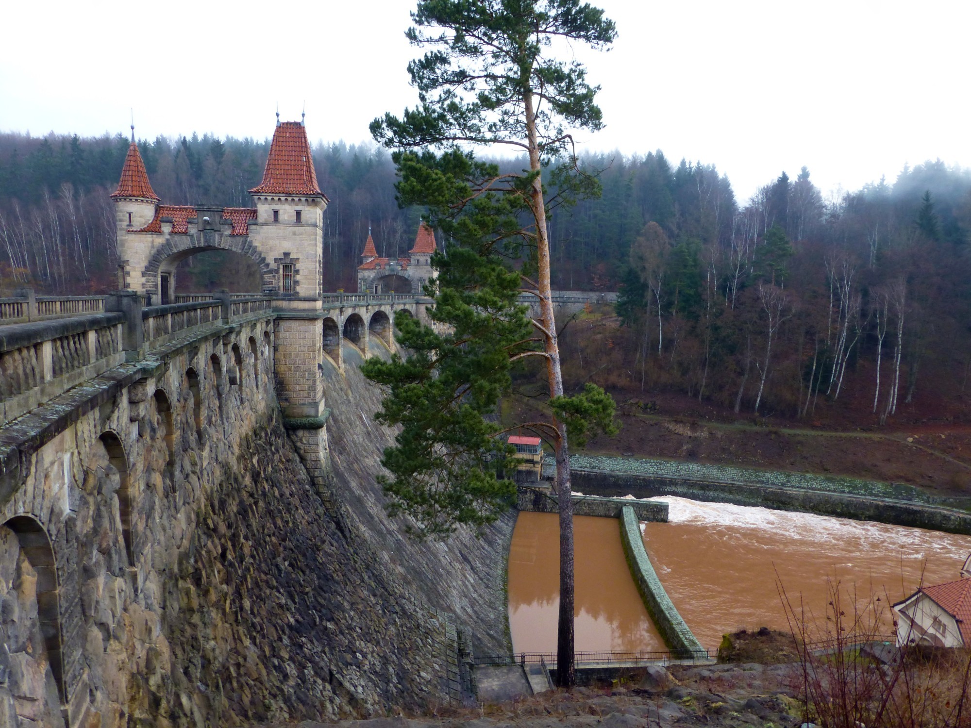 Nakonec v nejvyšším bodě je hráz vysoká 41m a může zatopit až 85 hektarů plochy, běžnější však je prý plocha okolo 60 hektarů. A proto, že přehrada je tolik stará, je i pěkně vyzdobena dvěmi branami s věžičkami a malým domečkem v hradním stylu pro pana hrázného.