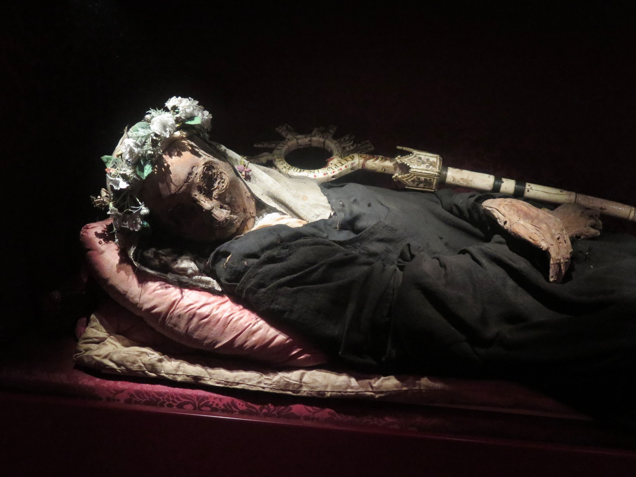 Svatá Nicolosa Bursa z Koperu žila v benediktinském klášteře sv Servolo poblíž Benátek, kde křížem a modlitbou uzdravovala nemocné. Představený kláštera ji u toho mnohokrát přichytil, jak – ozářena zvláštním světlem – levituje. Zemřela v roce 1512 a její neporušené tělo bylo exhumováno o 14 let později. Při otevření hrobu se prý rozšířila nádherná vůně a světice údajně i dnes vyzařuje pozitivní energii na vzdálenost 32 metrů. Najdeme zde i čtvrtou mumii, o které však všechny informační prameny tajuplně mlčí. Ta je označena jako sv. Pavel z Constantinople (+1350). Další světci a světice už jsou zastoupeni jen svými fragmenty - sv. Šebastián (+282) torzem, sv. Barbora (+288) nohou a Panna Marie Egyptská (+522) jazykem. Zapomenout nesmíme ani na sv. Eutychose (+582), patriarchu Konstantinopole, který zde „zanechal“ svůj ukazováček.