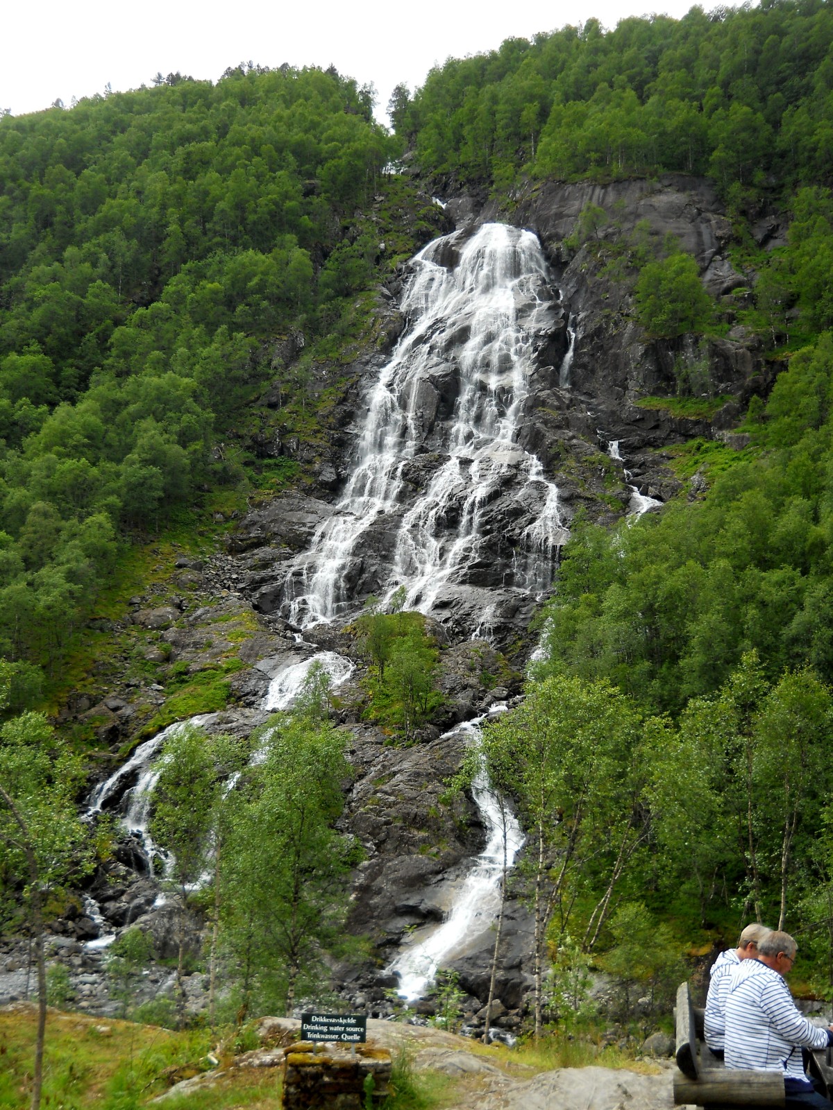 Od parkoviště se nechá sejít k řece Brattlandsdalåa, do které vodopád padá. Je vidět, když jsme se tam zastavili, že bylo málo vody i v této řece. Po kamenech se nechá dostat až přímo pod vodopád, který ale poměrně slušně tekl.