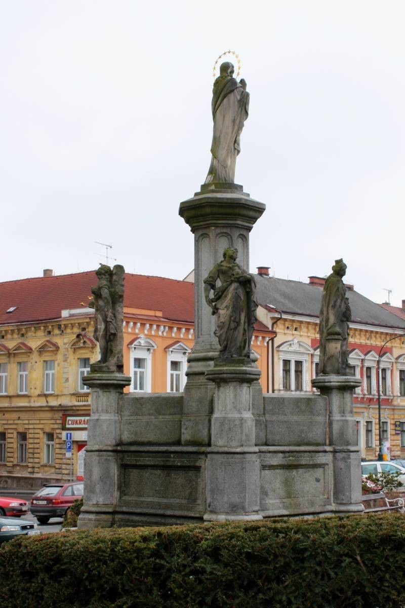 Sousoší na žulovém podstavci z roku 1877, na němž jsou umístněny starší pískovcové sochy sv. Rocha, sv. Šebastiána, sv. Barbory a sv. Rosalie z roku 1715 od M.J.J. Brokoffa. Okolo sloupu vedla asi 90 cm Vysoká zídka a v jejích rozích byly již dříve jmenované sochy. Při dláždění náměstí v roce 1872-1875 byly sloup i zídka odstraněny, doprostřed byla dána roku 1877 nová socha Panny Marie od sochařů bratří Jiříčků z Hořic a staré sochy byly umístěny na žulových podstavcích.