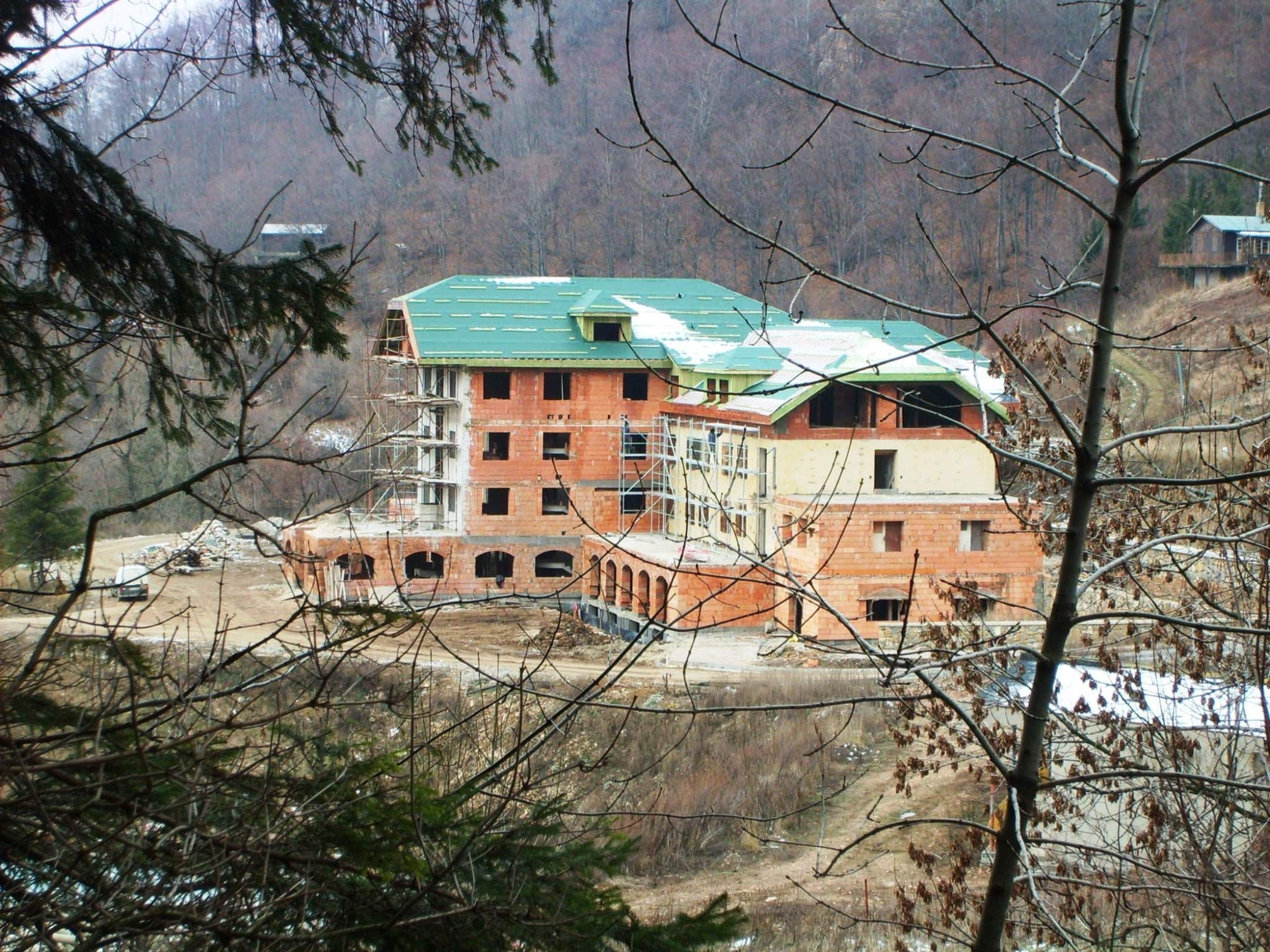 skorší jesenný pohľad na chatu ešte s chátrajúcim kúpaliskom